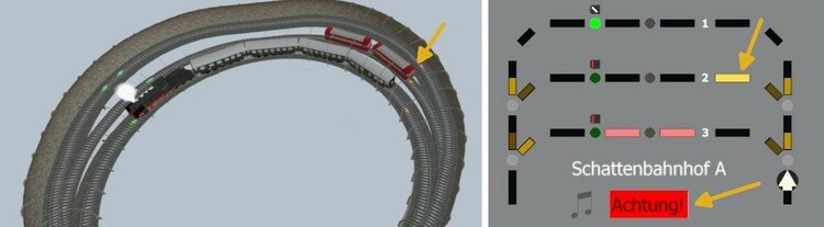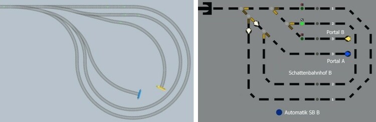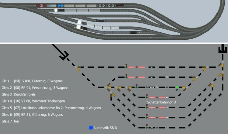Schattenbahnhof A (SB A) Wie in jedem Schattenbahnhof werden bei der Einfahrt die Weichen in Richtung Umfahrgleis gestellt. In diesem Schattenbahnhof haben der Eilzug mit einer Schlepptenderlokomotive BR 24 [Lok 02] und der zweiteilige Schienenbus [Lok 01] ihre Parkposition. Entsprechend werden die Weichen in Richtung Parkposition gestellt. Das geschieht, wie bereits zuvor beschrieben, unabhängig von der Schalterstellung des Tastschalters „Automatik SB A“. Bilder 33, 34: Gleisplan und Gleisbildstellpult vom Schattenbahnhof A In diesem Schattenbahnhof findet im Automatikbetrieb ein „rotierender“ Wechsel statt. Das bedeutet: Wenn ins freie Gleis 1 ein Zug einfährt (kommt vom Schattenbahnhof D), wird die Fahrstraße Ausfahrt Gleis 2 (Parkposition bzw. Abstellgleis vom Schienenbus) aktiviert. Der Schienenbus verlässt den Schattenbahnhof und kommt irgendwann wieder zurück. Dann wird er die im Gleis 3 stehende Lokomotive BR 24 aktivieren und der Personenzug dreht seine Runde. Sobald der Zug zurückkehrt löst er die Fahrstraße im Gleis 1 aus und das Ganze wiederholt sich solange, bis kein neuer Zug vom Schattenbahnhof D mehr kommt oder der Tastschalter „Automatik SB A“ ausgeschaltet wird. Jeder wird irgendwann gerne mal im laufenden Automatikbetrieb gerne manuell. So kann es durchaus vorkommen, dass der ins Gleis 1 einfahrende Zug den im Gleis 2 stehenden Schienenbus nicht starten kann, da dieser gar nicht vorhanden ist, sondern gerade manuell geführt unterwegs ist. In der ersten Version der Automatiksteuerung hängte diese sich dann auf. Jetzt ist der Schattenbahnhof so programmiert, dass wenn der zu startende Zug, in diesem Fall der Schienenbus, nicht vorhanden ist, der nächste Zug, in diesem Fall der Personenzug mit der BR 24, gestartet wird. Sind beide Züge nicht vorhanden, fährt der ins Gleis 1 einfahrende Zug einfach weiter. Für die Gleise 2 und 3 ist diese Automatikänderung aber nicht sinnvoll, da diese Gleise die Abstellgleise bzw. Parkpositionen für den Schienenbus und den Personenzug sind. Schattenbahnhof B (SB B) Im Schattenbahnhof B findet bei aktivierten Tastschalter „Automatik SB B“ lediglich ein Wechsel zwischen den Gleisen 1 und 2 statt. Das bedeutet, dass ein in Gleis 1 einfahrender Zug den in Gleis 2 stehenden Zug aktiviert und umgekehrt. Nach dem Einschalten des Tastschalters „Automatik SB B“ muss erst einmal ein Zug oder Triebwagen in den Schattenbahnhof einfahren und halten. Erst dann kann der Wechselbetrieb stattfinden. Umgekehrt bedeutet das aber auch, dass nach dem Ausschalten ein Zug oder Triebwagen im Schattenbahnhof verbleibt. Er wird nicht automatisch ausfahren. Dazu muss der Fahrdienstleiter aber lediglich die entsprechende Fahrstraße aktivieren. Anfangs gab es das Problem, dass der erste Zug nach der Aktivierung des Automatikbetriebs die Fahrstraße vom Parallelgleis (wo aber kein Zug steht) aktivierte und dadurch die Einfahrtweiche gesperrt war. Neu ankommende Züge konnten deshalb nicht in die korrekte Richtung des Schattenbahnhofs einfahren. Abhilfe schafften zusätzlichen Befehle „Fahrstraßen deaktivieren“ beim auslösenden Gleiskontakt „SB B Einfahrt“. Eine Besonderheit sind die Portale. Sie sind virtuelle Direktverbindungen zum Schattenbahnhof C und lassen sich bei einer echten Anlage nur sehr aufwendig realisieren. Abgesehen mal davon, dass für den Nachbau dieser MBS-Anlage der Raum (siehe Bild 1) verlängert werden müsste, so bliebe immer noch die Zimmertür als unüberwindbares Hindernis. Aber für echte Modellbauer ist das keine allzu große Herausforderung. Sie würden in ähnlichen Fällen wahrscheinlich eine Brücke von einem Anlagenschenkel zum anderen bauen. Diese müsste allerdings vor jedem Öffnen der Tür entfernt werden. Vorsichtshalber hängt an der Tür von außen ein Schild „Bitte nicht stören!“ und die Tür wird abgeschlossen. Da jeder dafür Verständnis hat kann man sich jetzt ungestört dem schönsten Hobby der Welt widmen. Es ist empfehlenswert das Portal A (blau) über die entsprechende Fahrstraße anzusteuern. So wird ein Zug oder Triebwagen auch bei eingeschalteter Automatik den Weg finden und nicht ins Gleis 1 oder Gleis 2 einfahren. Bilder 35, 36: Gleisplan und Gleisbildstellpult vom Schattenbahnhof B Schattenbahnhof C Den Schattenbahnhof C könnte man als Zusammenfassung von den Schattenbahnhöfen A und B interpretieren. Er besitzt 2 Abstellgleise, es kann Wechselbetrieb stattfinden und er hat Portale. Auf den fest zugeordneten Abstellgleisen haben der dreiteilige Schienenbus (Gleis 3) und die 4 Rungenwagon mit Baumstämmen hinter einer V65 (Gleis 2) ihre Parkpositionen. Das Portal B (gelb) lässt sich jedoch nur über die entsprechende Fahrstraße ansteuern. Begründet ist das durch die Identeinheit bei der Einfahrt. Egal ob die Automatik ein- oder ausgeschaltet ist, werden die Züge oder Triebwagen immer den Gleisen 1 bis 3 zugeordnet. Bei aktivierter Fahrstraße zum Portal B sind die Weichen aber gesperrt, die Weichenstellungen können durch die Identeinheit nicht verändert werden und das Portal B kann passiert werden. Bilder 37, 38: Gleisplan und Gleisbildstellpult vom Schattenbahnhof C Einem kritischen Leser ist bestimmt aufgefallen, dass Text und Bild nicht übereinstimmen. Der Schienenbus und die V65 haben ihre Parkplätze getauscht. Hintergrund: Im laufenden Betrieb wurde so mancher Güterwagen an den Güterzug zusätzlich angehängt und dann war das ehemalige Parkgleis einfach zu kurz. Eine Methode zu überprüfen ob eine zulässige Länge nicht überschritten wird ist mir zurzeit nicht bekannt - aber man lernt ja nie aus. Für diese Anlage ist so Feature aber nicht mehr geplant. Schattenbahnhof D Der Schattenbahnhof D ist das eigentliche Depot für einen abwechslungsreichen Betrieb. Auch hier ermöglicht die Automatik einen Wechselbetrieb. Der wesentliche Unterschied zu den anderen Schattenbahnhöfen aber ist, dass hier keine Kehrschleife integriert ist. Nachdem ein Zug g
