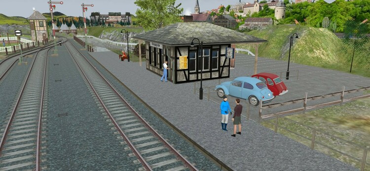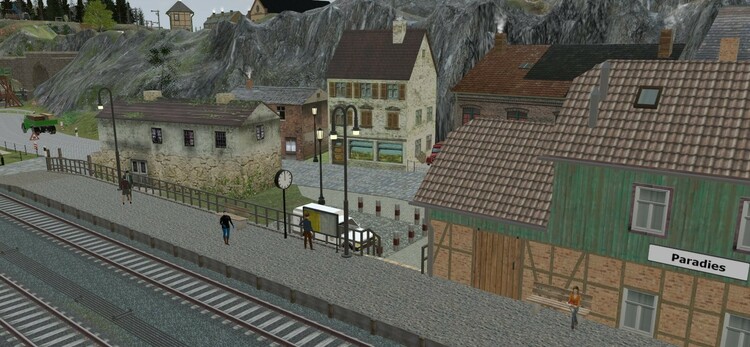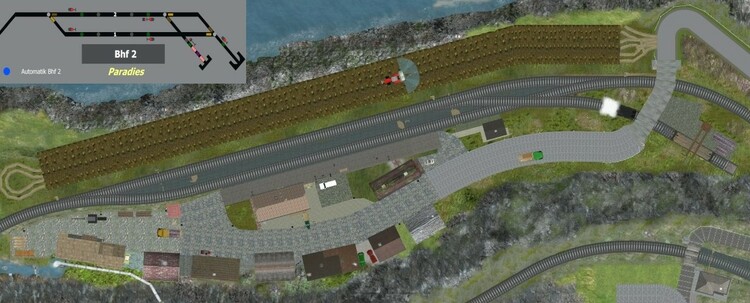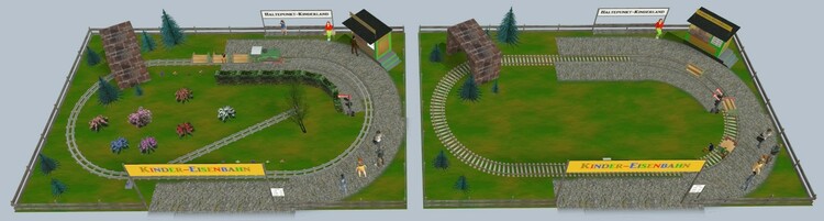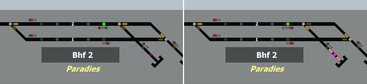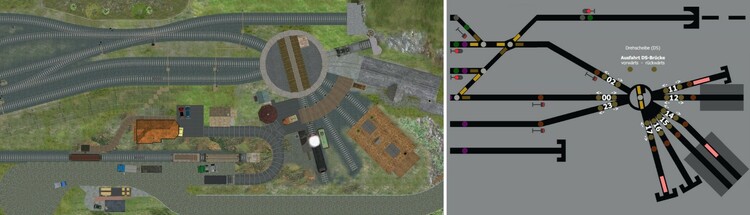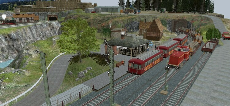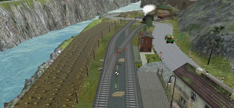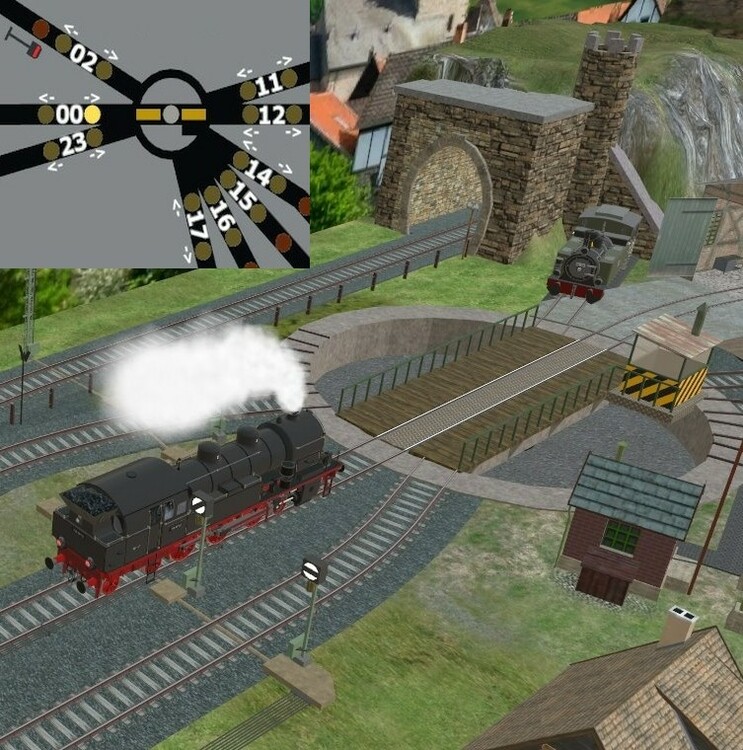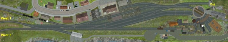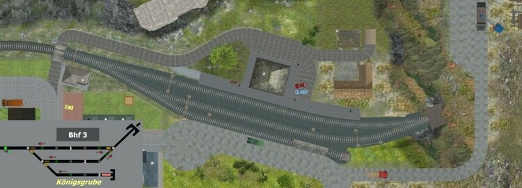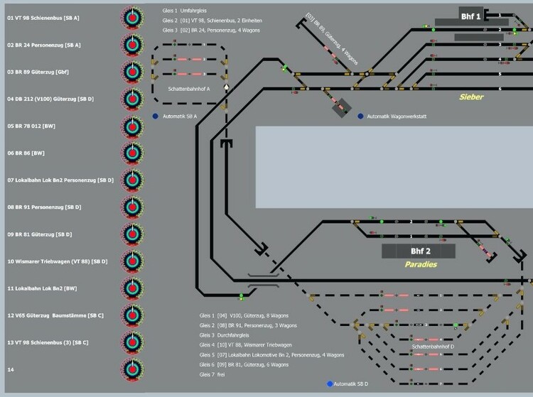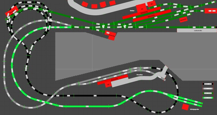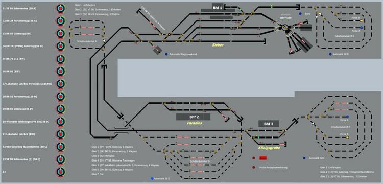 Einleitung Als Neuling hole ich mir gerne Anregungen und Informationen aus der Literatur. Leider sind viele Originalbücher als Neuanschaffung nicht mehr erhältlich. Aber glücklicherweise gibt es vergriffenen Bücher größtenteils bei den Verlagen auch als PDF. So auch das MIBA-Buch: „Anlagen-Planung für vorbildgerechten Modellbahn-Betrieb“ von Otto O. Kurbjuweit aus dem Jahr 2012. In diesem fand ich die hier vorgestellte Anlage. Das Konzept und die Beschreibung der Betriebsabläufe gefielen mir so gut, dass ich sofort den Wunsch verspürte diese Anlage nachzubauen. Das Vorbild, die Gleispläne Das Original mit ausführlicher Beschreibung der Anlage befindet sich im Kapitel „Von der Königsgrube zum Paradies (Vorbildlicher Betrieb auf der Siebertalbahn)“. Es handelt sich um eine fiktive Strecke zwischen dem nicht auf der Anlage befindlichen Bahnhof Siebertal (bei Herzberg am Harz) über Bahnhof Paradies zum Spitzbahnhof Sieber mit Anschluss zum Bahnhof Königsgrube. Bild 01: Originalzeichnung von Otto O. Kurbjuweit (mit freundlicher Genehmigung des Autors) „Realisiert“ habe ich die Anlage mit dem von mir favorisierten Gleissystem „Roco H0 Line mit Gleisbett“. Die Grundversion der Anlage wurde bereits in der Frühphase meinen Wünschen angepasst und teilweise modifiziert. So wurde beispielsweise der von Herr Kurbjuweit später im Buch erweiterte Einfahrtbereich vom Bahnhof Sieber direkt übernommen und zusätzlich ein kleines Bahnbetriebswerk mit Drehscheibe vorgesehen. Leider konnte ich einige Details nicht direkt übernehmen. Beispielsweise hat das Roco-Gleissystem keine 30°-Kreuzung und ein Mix verschiedener Hersteller oder Gleissysteme war keine Option. Auch zwei gerade Gleise einfach kreuzend übereinanderlegen, was in der Simulation ja kein Problem ist, kam nicht in Frage. Trotzdem habe ich mit dem Modelleditor manchmal etwas passend gemacht. Hier sei exemplarisch die Kreuzung im Bahnhof Paradies erwähnt. Das kreuzende Gleis habe ich etwas verkürzt damit es eine saubere Gleisverbindungen gibt. Ein Vorgang, den ich bei meinen damaligen realen Anlagen durchaus öfters vorgenommen hatte. Es wurde in der virtuellen Welt jetzt nur so modifiziert wie es die Realität zulässt. Kürzen von Gleisen ist gestattet, verlängern geht nicht. Die Kennzeichnung der Gleise erfolgte nachfolgendem Schema: Länge oder Radius sind in Millimeter, Winkel in Grad angegeben. Beispielsweise entspricht 230_0 einer Geraden mit 230 mm Länge und 888_15 entspricht einem Bogen mit 888 mm Radius bei einem Winkel von 15°. Die Formsignale passen von der Höhe her leider nicht in die Tunnelröhren. Sie einfach in der Z-Position zu verändern machte keinen Sinn, da dann der integrierte Gleiskontakt nicht mehr funktionierte. Deshalb wurden in den Schattenbahnhöfen niedrige Gleissperrlichtsignale eingesetzt. Das mag zwar ein Stilbruch sein, aber reale Schattenbahnhöfe kenne ich ja auch nicht. Bild 02: Gleisplan Grundversion mit Roco H0 Line Gleissystem Eine weitere und größere Änderung betraf das Gelände. Im Original handelt es sich um eine U-förmige Anlage in der sich der „Fahrdienstleiter“ mitten im Geschehen befindet. Anfangs hatte ich die Anlage auch dem entsprechend aufgebaut, aber nachdem das Gelände fast fertiggestellt war musste ich feststellen, dass sich der Betrachtungswinkel in der simulierten Welt erheblich vom Original unterscheidet. Deshalb wurde der begehbare Platz in der Mitte des Originals durch Gelände ersetzt. Um den Charakter der Anlage aber beizubehalten, hatte ich den jetzt zur Verfügung stehen Platz nicht einfach durch weitere Fahrstrecken ausgefüllt, sondern einen See als trennendes Element eingefügt. Bild 03: Anlage mit begehbarem Raum für den Bediener (ähnlich dem Original) Bild 04: Modifizierte Anlage mit See Der größte Unterschied zur Originalanlage von Herrn Kurbjuweit ist allerdings eine Anlagenerweiterung um drei zusätzliche Schattenbahnhöfe. Als Freund von rollenden Zügen im Automatikbetrieb war diese Ergänzung unbedingt notwendig. Äußerlich ist der Unterschied auf den ersten Blick kaum feststellbar. Die Betriebsabläufe aber ändern sich dadurch fundamental. Bild 05: Gleisplan erweiterte Anlage Eine Anlage – zwei Gesichter Diese Anlage kann in zwei Modi betrieben werden. Im Modus 1 (Modus Originalanlage) entspricht die Anlage weitestgehend der Vorlage von Otto O. Kurbjuweit. Die Züge kommen aus Siebertal (Schattenbahnhöfe A und D) und fahren über Paradies nach Sieber. Im Spitzkehrenbahnhof Sieber endet diese Strecke. Hier endet auch die Strecke vom Bahnhof Königsgrube. Durch eine Erweiterung im Einfahrtbereich von Sieber können jetzt aber zwei Züge gleichzeitig in den Bahnhof einfahren. Der Modus 2 (Modus Anlagenerweiterung) wurde auf den Automatikbetrieb abgestimmt. Es gibt zwei weitere Schattenbahnhöfe (B und C) in denen Zugwechsel stattfinden und außerdem noch weitere Züge geparkt sind. Aus den Spitzkehrenbahnhof Sieber wurde ein Trennungsbahnhof und der Endbahnhof Königsgrube wurde ein Zwischenbahnhof. Dadurch verlängerten sich die beiden Schenkel der U-förmigen Anlage nicht unerheblich. Aber der zusätzliche Fahrspaß war es mir wert und eine reale Zimmerwand musste ich ja auch nicht aufstemmen. Hier ein paar Impressionen von den unterschiedlichen Modi. Links die Originalanlage, rechts die Anlage mit Erweiterung. Bilder 06, 07: Bahnhof Königsgrube als Endbahnhof und Zwischenbahnhof In der Originalanlage von Otto O. Kurbjuweit endet die Strecke im Endbahnhof Königsgrube (siehe Bild 06) und es gibt es lediglich zwei Gleise (ein Abstellgleis und ein Bahnsteiggleis). Im GBS-Modell wurde das Wartehäuschen auf die Westseite (links) verlegt und das östliche Gleis mit einer Ladestraße ausgestattet. Zusätzlich gibt es mittig noch ein Abstellgleis. Der Grund dafür wird im Gleisplan der erweiterten Anlage (siehe Bild 05) sichtbar. Aus dem Endbahnhof wurde ein Zwischenbahnhof und das mittlere Gleis dient als Kreuzungs- oder
