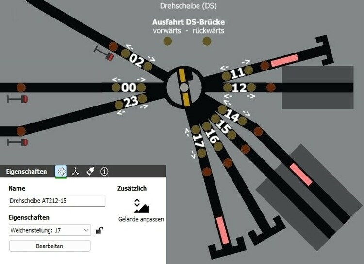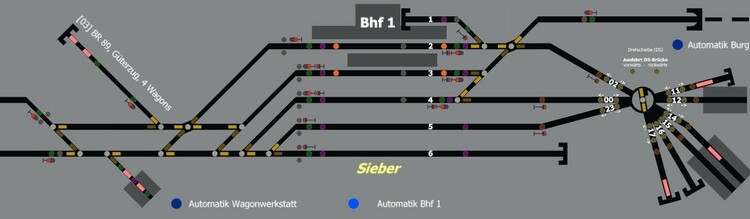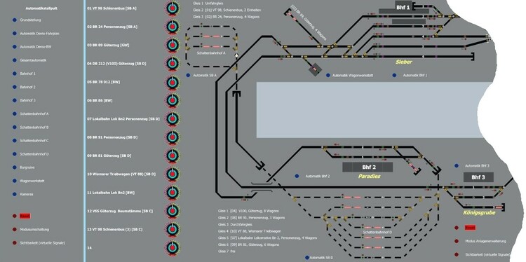 Ähnlich verhält es sich am Bahnhof Sieber. Hier wurde aus einem Spitzbahnhof ein Trennungsbahnhof. Die Züge fahren jetzt ohne Richtungswechsel in den Schattenbahnhof B mit Kehrschleife und kommen von dort immer noch vorwärtsfahrend wieder zurück. Bilder 08, 09: Bahnhof Sieber Ostseite Entsprechend des eingestellten Modus wird auch das Gleisbildstellpult (GBS) angepasst. In dem hier dargestellten Ausschnitt befindet sich auch der Umschalter für die Betriebsmodi. Bilder 10, 11: GBS vom Bahnhof Königsgrube mit Anzeige des gewählten Modus Eine Besonderheit, die sich in der Realität kaum verwirklichen ließe, sind die beiden Portalpaare. Hier können Züge direkt von einem Anlagenschenkel zum anderen fahren. Dadurch können jetzt beispielsweise Züge im Kreisverkehr durch Sieber fahren. Das hat zwar eher einen Spielzeugeisenbahncharakter, macht aber trotzdem viel Spaß beim Zuschauen in den automatischen Betriebsarten. Interessant wird die Situation, wenn zwei Züge in Gegenrichtung auf der eingleisigen Strecke zum Bahnhof Königsgrube fahren. Bei der ursprünglichen Version vom Bahnhof mit nur einem Abstellgleis wäre das nicht möglich gewesen. Anfangs hatte ich mich auch gesträubt das Abstellgleis in ein Kreuzungsgleis zu ändern. Erstens war der Platz dafür zu gering und zweitens wollte ich nicht jede Ecke mit Gleisen vollstopfen. Andererseits kommt so aber mehr Abwechslung in den Betrieb dieser eher ruhigen Ecke. Obwohl dieser Bereich der Anlage schon fertiggestellt war, wurde der Streckenabschnitt abgerissen und neu aufgebaut. Da in diesem Bahnhof eh nur die Triebwagen halten, konnte der Bahnsteig noch etwas gekürzt werden und das Kreuzungsgleis musste nicht unverhältnismäßig lang im Bezug zur restlichen Strecke ausfallen. Bild 12: Güterzug mit V65 kreuzt im Bahnhof stehenden Schienenbus Eine weitere Besonderheit ist, dass beim Umschalten von den einen Modus in den anderen Geländeteile und viele GBS-Bausteine aus- und eingeblendet werden. Anfangs hatte ich mir mit einer einfachen Abdeckung für die betroffenen GBS-Bereiche geholfen. In der 2D-Ansicht funktionierte das Ganze auch einigermaßen, aber sobald in die 3D-Ansicht umgeschaltet wurde, schwebte sozusagen die Abdeckplatte über dem Stellpult. Auch wenn ich nicht sehr penibel bin, aber so einen Zustand wollte ich dann doch nicht akzeptieren. Meine erste Idee, die betroffenen GBS-Bausteine, Signale und Geländebauteile alle einer speziellen Ebene (ich nannte sie „Ausblendungen“) zuzuordnen und diese dann über die Ereignisverwaltung (EV) auszublenden, konnte leider nicht realisiert werden, da es keinen Befehl (MBS V7) für die Ausblendung von Ebenen gibt. Ich habe also in den sauren Apfel gebissen und ca. 200 Objekte einzeln mit Schlagworten versehen und diese dann über die EV sichtbar bzw. unsichtbar gemacht. Letztendlich bin ich aber froh darüber diesen Aufwand betrieben zu haben. Das Ergebnis entspricht genau meiner Grundidee und Ergänzungen lassen sich nachträglich leicht einfügen. Gleisbildstellpult (GBS) Das Gleisbildstellpult wurde mittels der im Katalog angebotenen Bausteinen zusammengestellt. Um die Anzahl der Objekte zu minimieren, wurde weitestgehend auf Leerbausteine verzichtet. Stattdessen wurden, um die leeren Stellen zwischen den Spurbausteinen zu füllen, Hintergründe aus dem Grundkörper Quader generiert. Schwierig dabei war, die Farbe möglichst exakt der Farbe der GBS-Bausteine anzupassen. Ich wählte folgende Parameter: Farbt.: 160, Sätt.: 0, Hell.: 122, Rot: 130, Grün: 130, Blau: 130 mit Glanz 60% und Transparenz 0%. Eventuell könnte @BahnLand etwas dazu kommentieren um gegebenenfalls noch eine Feinjustierung bei den Grundkörpern vorzunehmen. Bild 13 Gleisbildstellpult Gesamtansicht ohne Automatikstellpult Bei der Steuerung der Signale stand ich vor der Wahl sie entweder direkt über Schalttaster anzusteuern oder indirekt über Fahrstraßen anzusprechen. Der erste Fall ist gut geeignet um als „Fahrdienstleiter“ alles manuell zu steuern und vorausschauend Konflikte zu vermeiden. Komfortabler (und professioneller?) ist es durch die Schalttaster Fahrstraßen anzusteuern und die Konfliktminimierung der Software zu überlassen. Allerdings gab es hier die „Problematik“, dass die Signale nach Zugdurchfahrt automatisch wieder auf Hp 0 gestellt wurden. Das ist zwar vorbildgerecht, aber um experimentell oder zu Testzwecken die Züge ohne weitere manuelle Eingriffe nonstop fahren zu lassen, eher ungeeignet. Etwas entscheidungsunwillig hatte ich dann beide Möglichkeiten vorgesehen. Die grünen Schalttaster beeinflussen die Signale direkt, die grau-weißen Schalttaster (grau = aus, weiß = ein) aktivieren Fahrstraßen. Im Detail bedeutet das aber auch, dass ein Signal welches durch einen grünen Schalttaster auf Hp 1 oder Hp 2 gestellt wurde, nicht automatisch nach Passieren des Zuges auf Hp 0 zurückschaltet wird. Wie zuvor erwähnt, geschieht bei der Steuerung über die Fahrstraße das Zurücksetzen auf Hp0 automatisch. Zusätzlich werden auch braun-orange Schaltaster eingesetzt. Mit ihnen werden die Gleissperrsignale an den Zufahrtsgleisen zur Drehscheibe angesteuert und es wurde, um Grubenfahrten zu verhindern, eine kleine Automatik programmiert. Dadurch geben die Gleissperrsignale die Fahrt erst frei, wenn die Drehscheibe die korrekte Position erreicht hat. Diese Automatik funktioniert unabhängig von der gewählten Betriebsart immer. Betriebsarten Die Steuerung der Züge kann in 4 Betriebsarten und teilweise sogar aus einem Mix der Betriebsarten erfolgen. Unabhängig von der gewählten Betriebsart werden die Züge oder Triebwagen aber immer automatisch ihrem Heimatgleis (Parkposition) jeweiligen Schattenbahnhof zugeführt. Betriebsart 1 – manueller Betrieb Der manuelle Betrieb kommt der Grundidee dieser Anlage am nächsten. Viel Rangierbetrieb ohne Automatikunterstützung im Hintergrund. Der Fahrdienstleiter muss alle Signale, Weichen und Schienenfahrzeuge von Hand bedienen. So