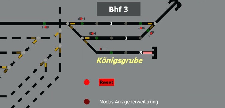 Betriebsart 3 – Automatikbetrieb In der Automatikbetriebsart muss zwischen den einzelnen Schattenbahnhöfen, den Bahnhöfen und dem Betriebswerk unterschieden werden. In sämtlichen Bereichen lassen sich die Automatiken einzeln ein- und ausschalten. Unabhängig davon aber werden die Schattenbahnhöfe immer nur in eine Richtung befahren. Zusätzlich wird bei der Einfahrt in einen Schattenbahnhof mit Parkpositionen geprüft, ob die einfahrende Lokomotive oder der einfahrende Triebwagen eine Parkposition in dem jeweiligen Schattenbahnhof hat. Da jede Lokomotive oder jeder Triebwagen eine feste Parkposition zugewiesen bekommen hat, ist der Programmieraufwand dafür relativ gering. Hat der einfahrende Zug keine Parkposition im entsprechenden Schattenbahnhof, wird er über ein Umfahrgleis ohne Halt durchgeleitet. Bewegt sich ein Zug sich im Schattenbahnhof regelwidrig in die falsche Richtung, so wird er vor der Zusammenführung in der Eingangsgleisharfe angehalten, auf dem GBS wird für 4 Sekunden der Schaltzustand „Spur reserviert“ angezeigt und es wird ein Alarmsignal (optisch und akustisch) ausgegeben. Gleichzeitig fährt der Zug automatisch bis zum nächsten Signal in korrekter Richtung vor. Im Regelbetrieb kann das zwar nicht vorkommen, aber wer hat sich nicht schon selbst dabei erwischt, dass er manuell in den Betriebsablauf eingegriffen hat. Auf diese Art wurde das Kollisionsrisiko zumindest etwas verkleinert. Bilder 22, 23: Der Schienenbus fuhr fälschlicherweise in die Gegenrichtung und wurde vor der Weiche rechts angehalten. Auf dem GBS wird dieser Fahrfehler 4 Sekunden lang angezeigt und der Schienenbus wird automatisch wieder bis zum Signal vorgefahren. Betriebsart 4: Vollautomatik / Demo-Fahrplan Diese Betriebsart ist ein starrer Fahrplan (Ablaufplan) nach dem Züge und Triebwagen über die Anlage manövriert werden. Die Anlage wurde in dieser Betriebsart veröffentlicht und bietet außer ein paar Impressionen auch die Möglichkeit sich einen Gesamteindruck zu verschaffen. Mit über 30 Kameras werden verschiedene Situationen und Fahrmanöver dargestellt. An dieser Stelle eine Zwischenbemerkung. Die blauen Automatik-Tastschalter wurden ursprünglich bei den entsprechenden Bahnhöfen platziert. Nachdem der Automatikumfang aber immer größer wurde hielt ich es für sinnvoll die Funktionen auch zentral ansteuern zu können. Deshalb wurde das GBS um ein Automatikstellpult erweitert. Die ursprünglichen Tastschalter blieben aber erhalten. Bild 24: GBS ergänzt durch Automatikstellpult Mit dem Einschalten der Funktion „Automatik Demo-Fahrplan“ wird zuerst ein Reset durchgeführt. Dadurch wird sichergestellt, dass keine Fahrstraßen mehr aktiv sind und alle Weichen entsperrt wurden. Danach wird die Anlage in die Grundstellung gebracht. Details zur Grundstellung stehen im übernächsten Kapitel. Daran anschließend wird die Kameraautomatik aktiviert. Sie lässt sich bei Bedarf jederzeit ausschalten und man kann seine Blickwinkel selbst ändern oder sich beispielsweise in ein Fahrzeug setzen und mitfahren. Zusätzlich wird auch noch die Automatik „Demo-Betriebswerk“ eingeschaltet. Das bedeutet, dass die zwei parallel ablaufenden Programme so abgestimmt wurden, dass es zu keinen Kollisionen oder Blockaden kommt. Es werden nicht auch alle vorhandenen Züge und Triebwagen eingesetzt. Es ging lediglich darum einen regen Betrieb darzustellen. Der „Film“ endet nach 16,5 Minuten. Wem das zu lang ist, der kann jederzeit die Automatik ausschalten. Es müssen dann aber die eventuell in den Bahnhöfen stehenden Züge oder Triebwagen manuell werteigefahren werden. Automatiken im Detail Demo-Betriebswerk Diese Vollautomatik führt ein Rangiermanöver im Bahnhof 1 Sieber durch. Die Lokomotive des vom nordwestlichen Anschlussgleis kommende Güterzugs soll im Betriebswerk behandelt werden. Da hierzu die Anhänger abgekuppelt werden müssen, die Bahnsteigleise (2 und 3) sowie das Überholungsgleis (4) nicht blockiert werden dürfen und außerdem eine direkte Anfahrt auf das Rangier-/Abstellgleis (5) ist nicht möglich ist, muss der Güterzug umfangreich rangiert werden. Außerdem muss eine auf dem Behandlungsgleis stehende Lokomotive BR 86 das Gleis zuvor räumen. Bei der Programmierung gab es verhältnismäßig wenig Probleme solange die Automatik für diese Demo alleine lief. Sobald aber noch reger Zugbetrieb durch die Automatik Demo-Fahrplan hinzukam wurde es spannend und aufwendig. Es gibt auch noch einen „Fehler“ im Programm den ich bis jetzt nicht beheben konnte. Für einen funktionierenden Ablauf spielt er aber keine Rolle. Bin ja gespannt ob der Fehler von jemanden gefunden wird. 😉 Zurück zum Rangieren. Der Güterzug fährt auf Gleis 3 ein und setzt nach kurzer Zeit zurück auf die Strecke Richtung Bahnhof 3 Königsgrube. Nach kurzem Stopp auf freier Strecke zieht er vor bis zum Entkupplungsgleis auf Gleis 5. Die Lokomotive (BR 89) kuppelt ab und fährt, nachdem die Drehscheibenbrücke auf die korrekter Stellung gedreht wurde, auf die Drehscheibe. Die Brücke wird jetzt so gedreht, dass die Lokomotive rückwärts auf das Lokbehandlungsgleis einfahren kann. Nachdem die Lokomotive Wasser und Kohle aufgenommen hat fährt sie über die Drehscheibe zurück aufs Gleis 5. Dabei setzt sie sich rückwärts wieder vor den Güterzug, kuppelt an und fährt rückwärts bis zum westlichen Gleissperrsignal. Wenn keine anderen Züge kreuzen fährt der Güterzug erneut auf die freie Strecke und setzt anschließend vor aufs Gleis 2. Nach kurzem Halt fährt er dann wieder auf das Anschlussgleis zurück. Der ganze Ablauf dauert etwas über 6 Minuten. Grundstellung Mit der Funktion Grundstellungen wird im Wesentlichen der Demo-Fahrplan vorbereitet. Sie ist aber auch für die meisten anderen Betriebsarten sinnvoll. Es wird ein Reset durchgeführt, die eventuell eingeschaltete Gesamtautomatik wird ausgeschaltet und lauffähige Personen werden aktiviert. Gesamtautomatik Der Tastschalter Gesamtaut