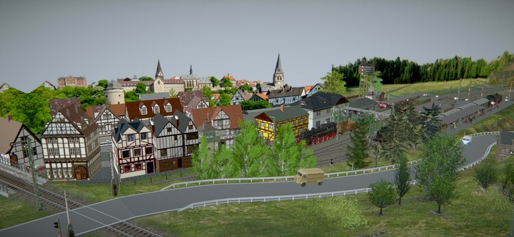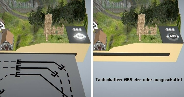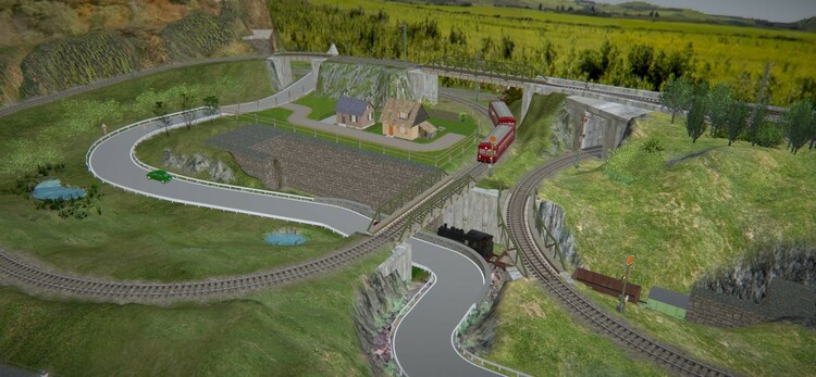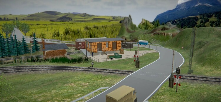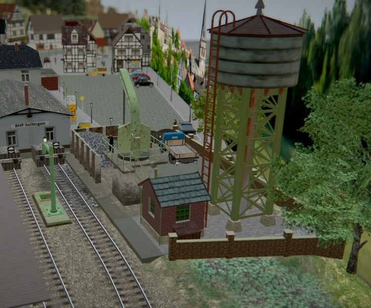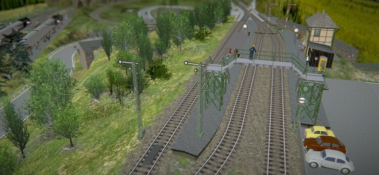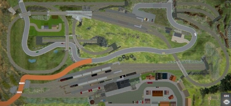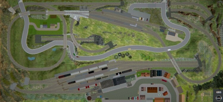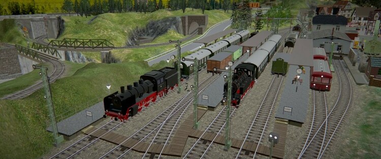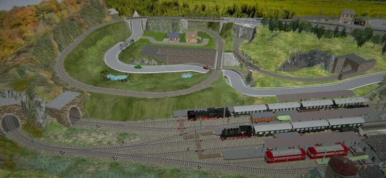 Der Anstoß für diese kleine Anlage kam aus der Vergangenheit. Ich hatte früher eine Arnold-Anlage und fand beim Kelleraufräumen viele alte Kataloge. Irgendwie kam da die Sehnsucht auf, doch noch einmal eine Arnold-Anlage zu bauen, diesmal aber virtuell. Leider fand ich das alte Gleisanlagenbuch nicht mehr (befindet sich bestimmt in der untersten Lage der Umzugskartons mit den Modellbahnutensilien) und so stöberte ich im Internet herum. Dabei stieß ich unter folgendem Link auf die Anlage 22 aus dem Gleisanlagenbuch 2 (Teil 1 war Technik, Teil 2 Baupläne). Quelle: arnold___n_gleisanlagenbuch__band_2_gleisplne_3_lgw.jpg (1600×745) (deerbe.com) Da ich mir nicht sicher bin ob eine Urheberverletzung vorliegt wenn den Plan einfach in dieses Dokument einfüge, gibt es hier lediglich den Link. Ich hätte zwar gerne die Erweiterung der Anlage gebaut, aber diesen Plan konnte ich leider nirgends im Internet finden. Bild 01: Draufsicht Bei der Streckenführung handelt es sich um zwei Gleisovale mit eigenen Stromkreisen und einer Nebenstrecke (dritter Stromkreis). Die Nebenstrecke zweigt vom äußeren Gleisoval ab, führt zum höher gelegenen Bahnhof 2 (im Gleisplanbuch steht: „Bergbahnhof“) und verläuft von dort aus wieder auf das Gleisoval zurück. Im „Talbahnhof“ (Bahnhof 1) ist dann noch ein Gleis als Minibetriebswerk vorhanden. Hierzu passend habe ich die Anlage in der Epoche III angesiedelt. Bild 02: Minibetriebswerk Die Anlage wurde aus 100% Arnoldgleismaterial erstellt. An der einen oder andere Stelle reizte es mich schon sehr flexibel mit den Gleisradien und -längen umzugehen. Der Modelleditor bietet da ja grenzenlose Möglichkeiten, aber genau das wollte ich ja diesmal ausschließen. Ein paar moderate Änderungen habe ich dann aber trotzdem vorgenommen. Der „Bergbahnhof“ (Bahnhof 2) bot keinen Platz für einen Inselbahnsteig und dieser war als solcher im Originalanlagenplan auch nicht vorgesehen. Hier gab es ledig ein Ausweichgleis im Standardparallelgleisabstand, sowie ein Gleis als Endbahnhof. Bild 03: Originalgleisplan mit Bergbahnhof als Endbahnhof und Ausweichgleis auf der Nebenstrecke Da ich aber ein Freund von rollenden Personenzügen bin, habe ich die Gleisabstände im Bergbahnhof geringfügig vergrößert damit auch Personenzüge ohne Richtungswechsel hier halten können. An der Struktur des Gleisplans hat sich damit aber nichts geändert. Bild 04: Modifizierter Bergbahnhof mit Inselbahnsteig Der zusätzliche Inselbahnsteig ist über eine Fußgängerbrücke erreichbar. Aufzüge und Fußgängertunnel gab es bei derart kleinen Bahnhöfen meiner Meinung nach noch nicht. Das Wartehäuschen und ein Stellwerk sind an die Westseite verlegt worden. Bild 05: Bergbahnhof von der Ostseite aus gesehen Anstatt des Bahnhofsgebäudes befindet sich jetzt an der Ostseite ein Güterschuppen. Bild 06: Güterschuppen am Bergbahnhof Beim Gelände mussten auch einige Änderungen durchgeführt werden. Die Streckenverläufe ließen sich nicht wie in der Anlagenzeichnung dargestellt realisieren. Es sei denn man würde Steigungen von über 30% bei der Bahn (Talbahnhofseinfahrt linke Seite) in Kauf nehmen. Außerdem habe ich Teile des Außenrings in Tunnel verborgen. Auf der linken Seite erschien mir das sinnvoll, da die linke Innenschleife nicht auf einer endlos langen Flachträgerbrücke zum Bergbahnhof ansteigen sollte. Außerdem musste die linke Straße aus ähnlichen Gründen entfallen (Steigung 100 % ). Hier zeigte sich erneut, dass der Zeichner zwar eine tolle Anlage in der Draufsicht (der Autor nannte es Luftbild) dargestellt hatte, das Gelände sich in dieser Form aber nicht halbwegs naturgetreu realisieren ließ. Im nachfolgenden Bild habe ich die entfallende Straße braun eingezeichnet. Damit die Straßen überhaupt einigermaßen auf die Anlage passen und dabei befahrbar bleiben, wurden sie auf den Faktor 0,8 skaliert. In der Originalzeichnung würde der Skalierungsfaktor maximal 0,5 betragen. Zur Verdeutlichung der Höhenunterschiede und daraus resultierenden Steigungen sind die Höhen im linken Teil eingetragen. Bild 07: Unrealistischer Streckenverlauf in der Originalzeichnung Bleibt noch anzumerken, dass aus genau den gleichen Gründen Änderungen im rechten oberen Bereich vorgenommen wurden. Eine weitere Änderung betrifft das Gleisbildstellwerk (GBS). Im Original befindet es sich mit Arnold Weichenschaltern an der Stelle, wo jetzt andeutungsweise eine kleine Ortschaft entstanden ist. Das GBS mit 3D-Studio-Bauelementen ist aber viel größer als das ursprüngliche Arnold-GBS . Selbstverständlich hätte auch die Skalierung der GBS-Bausteine verkleinert werden können. Das würde aber auf Kosten der Bedienbarkeit gehen und den Fahrspaß im manuellen Betrieb erheblich mindern. Das Stellpult wurde deshalb in Originalgröße als „Schublade“ an der vorderen Anlagenkante installiert. Die „Schublade“ mit Stellpult lässt sich über den in der unteren rechten Ecke auf der Anlage montierten Tastschalter GBS motorisiert herausziehen oder reinschieben. Aber Achtung! Die Schalterstellung EIN bedeutet nicht, dass die Schublade eingefahren ist, sondern, dass das Stellpult eingeschaltet wurde. Entsprechend bedeutet AUS, dass das Stellpult ausgeschaltet wurde. Wobei der Begriff ‚ausgeschaltet‘ nicht korrekt ist. Das Stellpult lässt sich lediglich mangels Erreichbarkeit der Schaltelemente nicht mehr bedienen. Bild 08: GBS-Tastschalter für die Schublade mit dem Stellpult Die Anlage wurde im Automatikbetrieb veröffentlicht. Die Züge fahren in loser Reihenfolge abwechselnd über die Anlage und nach 10 Minuten ist der Ursprungszustand wieder erreicht. Wenn nichts weiter unternommen wird, wiederholt sich so ein Zyklus kontinuierlich. Ihren besonderen Reiz entwickelt die Anlage aber im manuellen Betrieb. Obwohl es sich um einen relativ einfachen Gleisplan handelt, lässt sich ein interessanter Betrieb gestalten. Als Beispiel könnte die BR 24 vom Personenzug im Talbahnhof Gleis 5