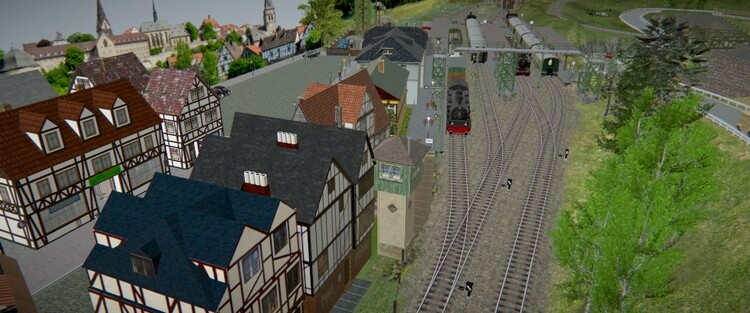 Das Umschalten von Automatikbetrieb in manuellen Betrieb und umgekehrt geschieht im GBS (unten rechts) mit dem Tastschalter „Automatik / Hand“. Der Automatikbetrieb wird über die blaue Leuchte „Zyklus läuft“ angezeigt (Bild 11). Sie bleibt so lange eingeschaltet, bis der Zyklus abschließend beendet wurde. Sobald in den manuellen Betrieb umgeschaltet wird, Tastschalter „Automatik / Hand“ zeigt „HAND“ an, wird der laufende Zyklus noch bis zum Programmende durchgeführt. Signalisiert wird dieses durch die blaue Leuchte „Zyklus wird beendet“ (Bild 12). Bild 10: Handbetrieb (HAND) Bild 11: Automatikbetrieb (AUTO) Bild 12: Übergang AUTO/HAND Am Ende des Zyklus wird automatisch ein Reset (roter Tastschalter) durchgeführt. Das ist an dieser Stelle zwar nicht notwendig, hat sich aber als vorteilhaft herausgestellt. Spätestens wenn man in den Automatikbetrieb manuell eingreift und es zu einer Kollision von Zügen oder einer Blockade von Weichen bzw. Fahrstraßen kommt, ist diese Funktion sehr hilfreich. Mit Reset werden alle Fahrstraßen deaktiviert, alle Signale auf Rot gestellt und sämtliche Weichen entsperrt. Bild 13: Tastschalter Reset und 5 Fahrtregler für den manuellen Betrieb Für einen problemlosen Ablauf im Automatikbetrieb müssen die Züge exakt wie auf dem GBS mit den blauen Pfeilen gekennzeichnet in der richtigen Richtung an den Bahnsteigen geparkt werden. Anfangs plante ich den Programmstart flexibler zu realisieren. Jeder Zug hätte sich an irgendeiner Position befinden können und würde sein „Heimatgleis“ selbstständig anfahren. Aber das war dann doch zu viel Aufwand und es gab für mich keine elegante Lösung. Dafür fehlt es mir (noch?) an Fachwissen. Deshalb ist es jetzt eine reine (einfache) Ablaufsteuerung ohne Verzweigungen im Programm geworden. Bild 14: GBS vom Talbahnhof mit Richtungspfeilen und Kennzeichnung der Automatikstartposition Die Gleisbesetztanzeigen habe ich bewusst so gewählt, dass die Fahrtrichtung am Bahnsteig auch ohne Blick auf die Anlage erkennbar ist. Ferner wird die auch die Durchfahrt an einem Signal angezeigt. Bild 15: Die Situation vom GBS in Bild 14 in der „Realität“ Bild 16: Die gleiche Situation vom Osten aus gesehen Bei allen Dampflokomotiven wurde der Rauch abgestellt. Bedingt durch die geringen Höhenunterschiede der Ebenen kam der Rauch sozusagen aus dem Erdreich sobald eine Lokomotive in einen Tunnel fuhr. Die geringen Höhenunterschiede hatte ich bewusst gewählt, damit die ohnehin schon steilen Steigungen der Gleise nicht noch unglaubwürdiger wurden. Eine Zeit lang hatte ich versucht über die Ereignisverwaltung (EV) den Rauch beim Tunneleintritt auszuschalten und entsprechend bei der Ausfahrt aus einem Tunnel wieder einzuschalten. Manuel hatte ich das zuvor ausprobiert und der Effekt war überzeugend. Aber leider habe ich keine Möglichkeit das zu automatisieren gefunden; auch nicht in den Foren. Eventuell bekomme ich ja auf diesem Weg jetzt einen Tipp. Zum Schluss noch ein paar Impressionen. Im Bild 17 unterquert der Güterzug mit der BR 80 ohne Dampf die mittigen Flachträgerbrücken. Eine Ebene höher ist der Schienenbus auf dem Weg zum Bergbahnhof. Bild 17: BR 80 und Schienenbus sowie der VW Käfer in Fahrt Eine weiterer Eindruck: Vom Güterschuppen aus gesehen in Richtung Kleinstadt. Bild 18: Blick vom Güterbahnhof in Richtung Kleinstadt. Nach den Impressionen noch ein Hinweis auf ein Problem bei den Fahrstraßen. Sobald sich ein Signal an einem Entkupplungsgleis befand, ließ sich die an dieser Stelle beginnende Fahrstraße nicht aktivieren. Es kam immer die Meldung: „Blockiert, warte auf Freigabe“. Da ich aber die Möglichkeiten der Fahrstraßen nutzen wollte, habe ich die Entkupplungsgleise durch normale Gleise ersetzt und alles funktionierte einwandfrei. Dieses Manko sah ich als nicht so tragisch an, da das Abkuppeln der Anhänger von der Lok ja auch im Steuerfenster der Lok erfolgen kann. Wie geht es weiter? Götz hatte dankenswerterweise ein Video zum Thema Fahrstraßen mit GBS verbinden veröffentlicht. Das Tutorium ist meiner Meinung nach klasse und ermöglicht auch einem Amateur wie mich die Steuerung noch komfortabler zu gestalten. Allerdings muss ich dazu noch etwas (oder etwas mehr?) lernen, üben und probieren. Tja, und das dauert noch etwas. Beste Grüße Spurwechsel