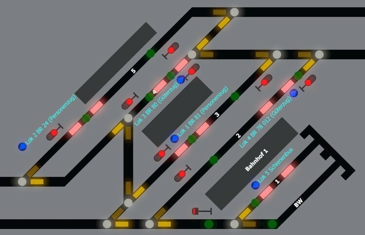 Teil 5 der Anlagenbeschreibung Bevor es mit der Anlagenbeschreibung weiter geht möchte ich mich erst einmal bei Andy und Götz bedanken. Sie gaben mir einen Motivationsschub um die Beschreibung fortzusetzen. Vielen Dank auch an BahnLand für die Tipps den Text mit den Bildern ansprechender zu gestalten. Direkt an der Altstadt grenzt ein Bahnbetriebswerk. Sie richtig viel Sinn macht es an dieser Stelle zwar nicht, aber ich wollte unbedingt, wie bei meiner realen Anlage vor über 30 Jahren, eine Drehscheibe mit Ringlockschuppen unterbringen. Als Ausrede dafür könnte unter anderen gelten, dass Museumszüge und Sonderfahrten vom Bahnhof 2 starten und hier auch wieder enden. Bild 23: Betriebswerk mit Drehscheibe und Ringlokschuppen Um das Areal vom Betriebswerk auch optische vom Rest der Anlage etwas zu trennen, versuchte ich erstmals die Schienen mit einer Textur zu versehen. Auch wenn es in der Realität wahrscheinlich anders aussieht – mir ist es nicht besser gelungen und es gefällt mir auch so. Bild 23 zeigt die zentrale Drehscheibe mit Ringlokschuppen und ein kleines Versorgungsgleis für die Dampfloks. Etwas versteckt hinter der Altstadt befindet sich der Bereich für die Dieselloks (Bild 24). Hier gibt es auch die Möglichkeit an den Ladegleisen und Lagern zu rangieren. Da der Schwerpunkt dieser Anlage allerdings den rollenden Betrieb gelegt wurde, fehlen die dazu notwendigen Handregler und es wurde dieser Aspekt auch nicht weiter verfolgt. Bild 24: Hinterer Bereich der Betriebswerks für Dieselloks Es gibt einen kleinen Automatikbetrieb im Betriebswerk der am Automatikstellpult gestartet werden kann (Taster Bahnbetriebswerk). Bild 25: Automatikstellpult mit Markierung für den Automatikbetrieb im Betriebswerk Eine Dampflok BR 81 entkuppelt sich von ihren Personenwagen (Donnerbüchse rot) im Bahnhof 2 und fährt auf die Drehscheibe. Diese dreht die Lok so, dass sie zur kleinen Bekohlungsanlage mit Wasserkran fahren kann. Nachdem die BR 81 die Drehscheibe verlassen hat, startet im modernen Lokschuppen eine Diesellok V200 und fährt auf die Drehscheibe. Nach entsprechender Drehung fährt sie dann in den Ringlokschuppen. Nach einer kurzen Pause befährt die BR 81 wieder die Drehscheibe und setzt sich wieder vor die Personenwagen. Der Zug bleibt aber im Bahnhof. Jetzt verlässt die V200 den Ringlokschuppen und macht sich auf den Weg zum modernen Lokschuppen. Solange der Tastschalter „Bahnbetriebswerk AUS“ nicht betätigt wurde, wiederholt sich der Ablauf kontinuierlich. Im Bahnhof 2 startet auch noch ein zweiter Zug im Automatikbetrieb. Aktiviert wird ein Personenzug mit einer Dampflok BR 24 durch den Tastschalter „Bf2 Personenzug BR 24“. So nebenbei sei bemerkt, dass das genau die Situation ist in der sich die Anlage nach dem herunterladen befindet. Bild 26: BR 24 mit Personenwagen (Donnerbüchse) kurz vor dem Start Der Zug ist auf dem Abstellgleis an der Lärmschutzwand bei den Altstadtarkaden geparkt. Er fährt in den Bahnhof 2 ein, wartet ca. 1 Minute und fährt dann in Richtung Westen weiter. Die Streckenführung verläuft anfangs parallel zur Hauptstrecke. Im Gegensatz zur Hauptstrecke gibt es im hinteren Bereich für die Nebenstrecke aber keine Anstiegsrampe. Die Züge unterqueren hinter den Altstadtarkaden die Hauptstrecke und werden durch einen Tunnel zum Bahnhof 3 geführt. Allerdings anders als bei der Hauptstrecke erfolgt die Einfahrt in den Bahnhof 3 nicht von der Nordwestseite, sondern von der Südostseite. Nach einer Haltezeit von 50 Sekunden fährt der Zug in langsamer Geschwindigkeit weiter, umrundet in einer Kehrschleife das Szeneviertel und fährt dann in entgegengesetzter Richtung wieder in den Bahnhof 3 ein. Nach kurzem Halt setzt sich der Zug dann wieder in Richtung Bahnhof 2 in Bewegung. Im Tunnel befindet sich ein Gleisdreieck im der Zug dann zur Ostseite vom Bahnhof 2 geleitet wird. Damit ist der Zyklus „Bhf 2 Personenzug“ beendet. Der Zyklus wird so lange durchgeführt, bis der entsprechende Tastschalter „AUS“ betätigt wird. Wenn der Tastschalter aktiviert ist, leuchten die Schalter EIN und AUS gleichzeitig. Der Ablauf ist so programmiert, dass die BR 24 nach Ankunft im Bahnhof 2 auf das Abstellgleis zurücksetzt. Hat der Zug die Parkposition erreicht, wird der Antrieb ausgeschalte und es erlöschen die Leuchtmelder der beiden Tastschalter auf dem GBS. Bild 27: Automatikstellpult mit Markierung für den Automatikbetrieb BR 24 und BR 80 Es gibt noch einen dritten Zug der dem Bahnhof 2 zugeordnet wurde. Es ist ein im Tunnel geparkter Güterzug mit einer Dampflok BR 80. Gestartet wird dem Tastschalter „+ Bhf2 BR 80 Güterzug“. Allerdings lässt sich dieser Zug nur dann automatisch starten, wenn die BR 24 fleißig ihre Runden dreht. Es ist auch nur eine kleine Runde die der Güterzug zurücklegt. Über das Gleisdreieck im Tunnel wird der Zug direkt wieder zu seiner Parkposition und anschließend zur Ostseite vom Bahnhof 2 geleitet. Das Startsignal zur Einfahrt in den Bahnhof 2 erfolgt immer durch die BR 24. Dadurch kommt es 1. zu keinen Kollisionen und 2. wird nicht sofort offensichtlich, dass der Güterzug lediglich ein kleines Gleisoval umrundet. Auf die Automatik von der AKN gehe ich zu einem späteren Zeitpunkt ein. Bild 28: Güterzug mit BR 80 bei der Durchfahrt vom Bahnhof 2 Zurück zur Hauptstrecke. Im Bahnhof 2 halten lediglich Nahverkehrszüge und S-Bahnen. Sollte ein anderer Zuggattungen dort mal zum Stehen kommen, so liegt es fast immer daran, dass der nächste Streckenabschnitt nicht frei ist. Auch wenn diese Anlage noch keine Blockstreckensteuerung aufweist, so hatte ich die Ablaufsequenzen in den verschiedenen Automatikszenen (Erklärung folgt später) entsprechend programmiert. Dieser Teil der Anlagenbeschreibung musste etwas auf sich warten lassen. Jetzt habe ich wieder Zeit für das schönste Hobby der Welt und werde den Teil 6 in Kürze anfügen.