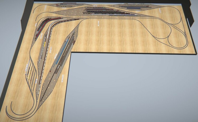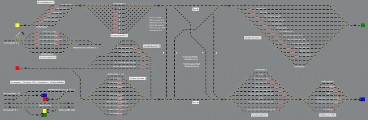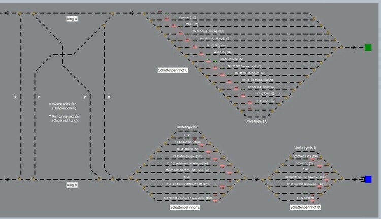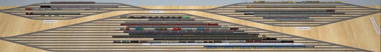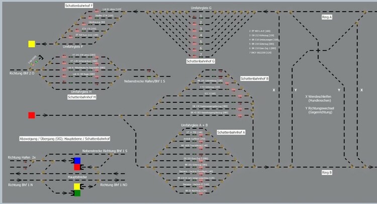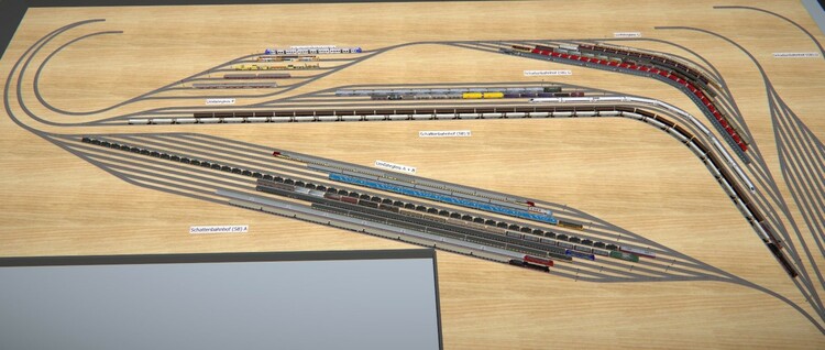 Andy ermunterte mich, meine Anlage „8 Bahnhöfe, viel Betrieb“ in diesem Forum vorzustellen. Das möchte ich ab heute versuchen und so nach und nach die einzelnen Abschnitte und Ideen dahinter zu beschreiben. Beginne ich mal mit dem Namen. Bei mir auf dem Rechner hatte ich die Anlage lediglich unter dem Namen „Anlage 2 357_1 final“ abgespeichert. Für eine Veröffentlichung erschien mir diese Bezeichnung aber ungeeignet und so suchte ich nach einem besseren Namen. Da ich relativ unkreativ bin, dauerte dieser Vorgang erheblich länger als beispielsweise der Bau von so manchem Anlagendetail. Reduziert auf die Anzahl der Bahnhöfe und meiner Grundidee zu dieser Anlage (viel Automatikbetrieb) kam ich dann schließlich auf diesen (eigenartigen?) Namen. Als H0-Neuling entschied ich mich für das Gleissystem von Rocco. Dieses System erschien mir als am übersichtlichsten und sehr gut strukturiert. Real hatte ich früher Anlagen in der Spurgröße N von Arnold gebaut. Damit viel abwechslungsreicher Betrieb auf der Anlage stattfinden kann, musste ein entsprechend großer Schattenbahnhof vorgesehen werden. Es sollte eine Anlage mit einer zweigleisigen Hauptstrecke und einigen Nebenstrecken werden. Außerdem sollte eine große Bahnbrücke ein Tal mit Bahnverkehr überspannen. Im Schattenbahnhof sollte es möglich sein, die Züge nach dem Hundeknochenprinzip die Fahrtrichtung zu wechseln um damit die Fahrtzeit zu verdoppeln. Zusätzlich wurde vorgesehen, dass die Züge auch in Gegenrichtung auf der zweigleisigen Hauptstrecke fahren können. Bild 1: Schattenbahnhof/-höfe (total)