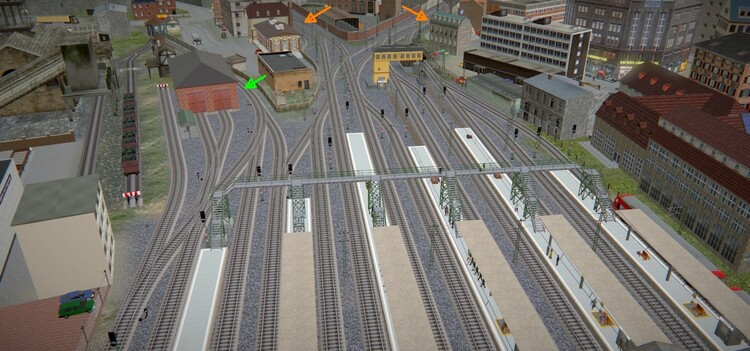 Im nachfolgenden Bild sieht man den Einfahrtsbereich vom Bhf 1/Hbf mit den beiden Strecken die vom Schattenbahnhof kommen (orange Pfeile). Die Nebenstrecke der Hafenbahn ist mit einem grünen Pfeil gekennzeichnet. Bild 11: Bahnhof 1 (Hbf) Nordseite