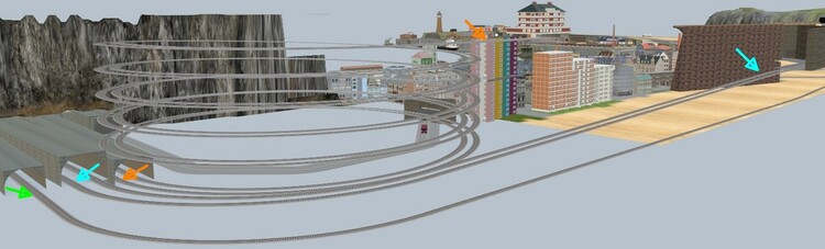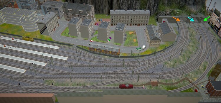 Auf der Südseite führen die Strecken über einen Gleiswendel zum Bahnhof 6 (oranger Pfeil), über eine Rampe zum Bahnhof 3 (blauer Pfeil) und ebenerdig einmal um die gesamte Außenkante entlang zum Hafen unterhalb vom Bahnhof 2 (grüner Pfeil). Bild 13: Bahnhof 1 (Hbf) Südseite