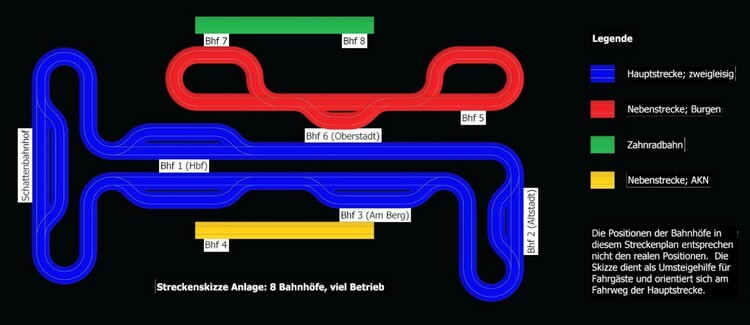 Teil 2 der Anlagenbeschreibung Ergänzend zu den Schattenbahnhöfen möchte ich noch erwähnen, dass als weitere Sicherheit bei allen Zügen noch vor der Einfahrt in den ersten Schattenbahnhof die Geschwindigkeit auf 80 km/h eingestellt wird. Somit wird die Gefahr eines Auffahrunfalls (ICE mit 160 km/h fährt hinter Güterzug mit 80 km/h) im Schattenbahnhof erheblich reduziert. Da jeder Zug oder Triebwagen sein fest zugordnetes Gleis hat und in der Regel nach einer Runde dort anhält, gab es in der ersten Phase der Anlagenentwicklung keine Probleme. Erst als ich einige Züge nicht anhalten ließ musste ich feststellen, dass diese Züge unabhängig von ihrer Kategorie immer mit 80 km/h den Schattenbahnhof verließen und gemächlich in den Hauptbahnhof einfuhren. Das betraf auch Schnellzüge die hier nicht anhielten. Also wurde die EV so programmiert, dass jeder Zug im Schattenbahnhof nach passieren des Signals auf seine Sollgeschwindigkeit beschleunigt wird. Die Möglichkeit Schlagwörter dafür zu benutzen war mir damals noch nicht bekannt. Nachträglich ändern wollte ich die EV allerdings auch nicht mehr („never change a running system“ passt hier wirklich). Kommen wir zum Streckenverlauf. Einen Überblick über den Streckenverlauf der Hauptstrecke und damit die Reihenfolge der angefahrenen Bahnhöfe, kann man folgendem Streckenplan entnehmen. Die Positionen der Bahnhöfe im Streckenplan entsprechen aber nicht den realen Positionen in der Anlage. Für „Fahrgäste“ kann dieser Plan aber gut als Verkehrsnetzplan oder Umsteigehilfe genutzt werden. Bild 9: Streckenplan