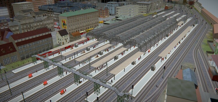 Der Bahnhof hat 8 Bahnsteige für die Hauptstrecken und 4 Bahnsteige für Nebenstrecken. Da 13. Gleis ist ein Güterzuggleis für die Hafenbahn (rechts im Bild). Bei der Elektrifizierung habe ich mich etwas zurückgehalten. Es wurde nur die Hauptstrecke mit einer Oberleitung ausgestattet. Bild 12: Bahnhof 1 (Hbf) Bahnsteige