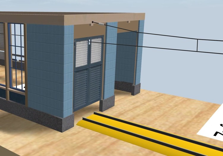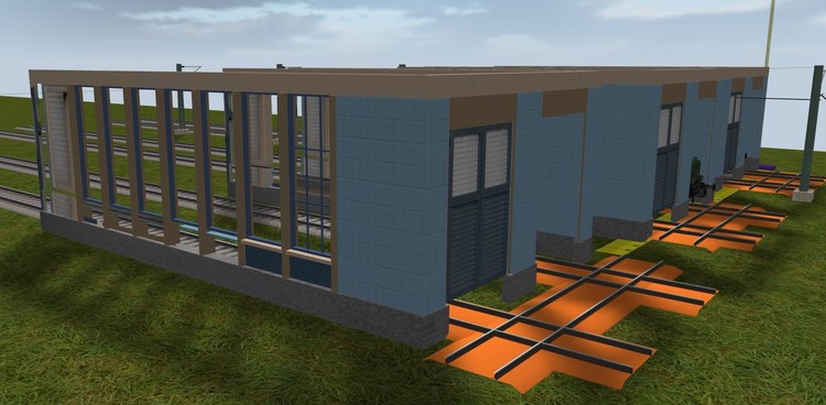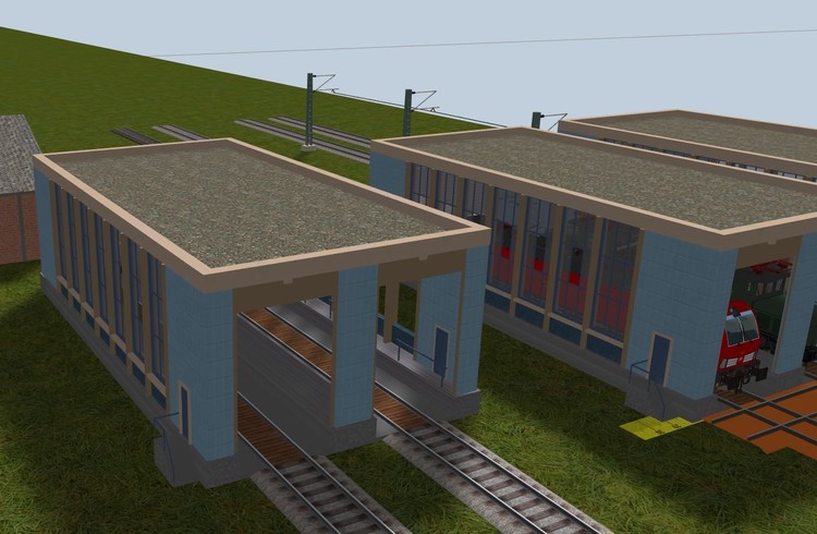 19. Ok, die Fahrleitung selber rastet nicht ein, sondern nur die Tragleitung. Am Ausleger rastet sie nicht ein, geht das nicht? Dann baue ich die Isolatoren und die Fahrleitung in einer Variante des Lokschuppens fest ins Modell ein. Wenn ich da am äußeren Isolator einen Kontaktpunkt setze, müßte die Oberleitung ja einrasten?