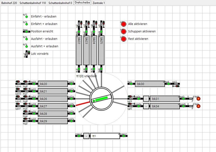 Die letzten 2 Wochen hab ich mich mal intensiv mit Rocrail beschäftigt. Auf der Anlage fahren jetzt die ersten 4 Loks im geregelten Zufalls-Automatikbetrieb. Alle Fahrstraßen sind soweit fertiggestelt. Bei der Drehscheibe hab ich alles neu gemacht, damit sie sich wie eine normale digitale Drehscheibe verhält. Als Nächstes gehe ich die Container Be- und Entladung an. Ziel: 2 gleisig. Zug fährt in erstes Gleis ein. Zug wird in der Mitte getrennt. Rangierlok holt hinteren Teil ab und fährt ihn ins 2. Gleis. Kran verrichtet Arbeit. Zug wird wieder zusammengestellt. Neue Lok fährt vor den Zug. (Lokwechsel) und fährt in Gegenrichtung ab. Alte Lok wartet auf den nächsten Zug.- Schattenbahnhof mit Rocrail