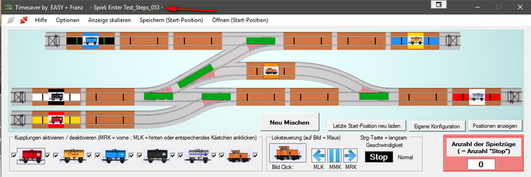 Nachdem EASY hier die Funktion seiner gelungenen Steuerung erklärt hat möchte ich diesen Beitrag ins Leben rufen um (siehe Betreff) Erfolge auszutauschen. Vorab aber mein Dank an EASY. Das Programmieren der Steuerung war der weitaus schwierigere Part. Meine Aufgabe bestand lediglich darin, eine kleine Anlage zu bauen und EASY mit teils unerwünschten Ideen zu belästigen. Super gemacht EASY. Warum dieser Beitrag? Um die Motivation aufrecht zu erhalten. Sicher ist Euch im Menü der Steuerung der Menüpunkt "Speichern (Start-Position)" und "Öffnen (Start-Position)" aufgefallen. Der Sinn: Wenn ihr glaubt eine Aufgabe in sehr wenigen Spielzügen geschafft zu haben klickt einfach auf "Speichern (Start-Position) und speichert das ganze. EASY's Programm erweitert selbstständig den Dateinamen um die Anzahl der gefahrenen Rangierfahrten. Wenn ihr diese xml-Datei dann in einer Zip verpackt und vielleicht noch ein Bild der Ausgangssituation macht (geht aber auch ohne) könnt ihr eure Lösung hier einstellen und Andere können versuchen es besser zu machen. Ich mache auch gleich den Anfang. So sah mein Ausgangsbild aus: Oben (dort wo der Pfeil ist) könnt ihr ablesen wie viele Fahrten ich benötigt habe. Und die Datei "Erster Test_Steps_053.zip" enthält nach dem Entpacken die Ausgangssituation meiner Anlage die ihr über "Öffnen (Start-Position)" einlesen könnt. Viel Spaß damit Franz Erster Test_Steps_053.zip