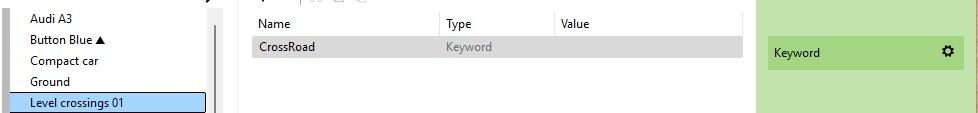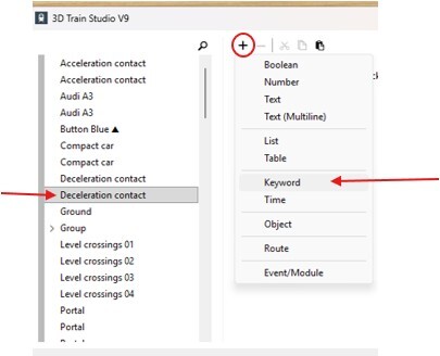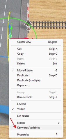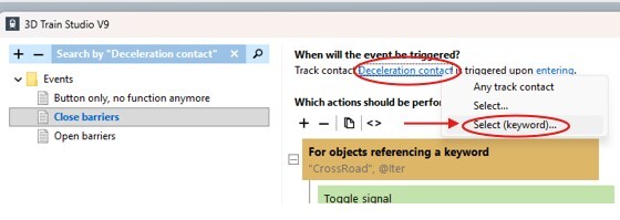 Hello members. This was finished this weekend, I hesitated to place it still , so why not? For beginners only. First take my last layout; rename and save. Something about keywords. We have seen that a keyword is used in the repetition “for objects referencing a keyword”. But the power of a keyword goes beyond this. In stead of let the event management check if something is happening on an object ( example Track Contact is triggered ), it is possible to let it work on all objects with a certain keyword. The following is an illustration of this principle, we will use in our barriers problem. Give the deceleration contact a keyword. Name it BeforeCrPt. Give the acceleration contact a keyword. Name it AfterCrPt. Go to the event in the EM ( EV in German ), Close Barriers. Click on the object (Deceleration contact ) , choose select keyword, then choose the correct keyword name. Do the same for for Open Barriers, with the correct keyword. ( AfterCrPt ) Copy the deceleration contact and paste it on the other rail far enough from the crossing. Copy the acceleration contact and paste it on the other rail just after the crossing. Congratulations, the code that you wrote only once for closing the barriers, works now for each track contact with that keyword. The same for opening the barriers. There is only one incoming train at the same time in this layout. So it works. From the moment that an incoming train is still coming, and an outgoing train opens the barriers, it goes wrong. The solution is counting the incoming trains ( +1 to a variable when entering , -1 when leaving ), and only open the barriers if no incoming trains are there. But I'm not going to handle that for the moment. Kind regards, Herman Stephen 04 Barriers.mbp
