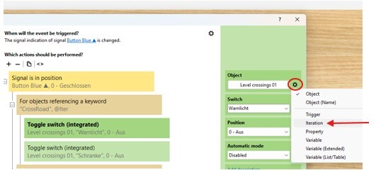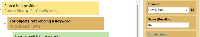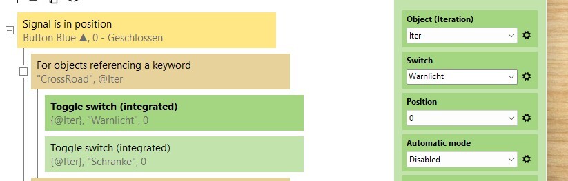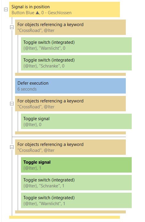 Hello @swcurrill , Stephen, Hello Stephen, only read this if you are ready understanding the previous code above. This is an answer to your main question : handle 4 barriers together. --- This solution uses a keyword. A keyword is a special variable on an object. It can be used in a repetition, so that all actions are done on objects with the same keyword. And you have to write those actions only once inside the repetition. -- Take my demo above, save it under a new name, and delete the second barrier. Keep the EV. Change in the properties of the barrier the variation , so that it is an half barrier. --- Click right (mouse button) on the barrier and choose keyword and variables, give it a name. --- Done. --- Now use duplicate multiple to create 3 other simular barriers. The keyword is copied automaticly. Now all four have the same keyword. Change Variations (2x right, 2x left) --- You need a repetition (iteration). For objects referencing a keyword. And an iteration name, here Iter. For objects referencing a keyword, starts a repetition, that handles each object with that keyword one by one, until all are done. The name of the iteration is given. (here Iter, you can take another name, leave it for now). In each repetition, the iteration Iter is replaced by an object with the specific keyword. The system does that. A repetition has a start (title) and end (end line) in brown. The actions between are subject of the repetition. Change all objects (Level Crossing 01 ) in the actions (for the repetition) by the iteration name Iter. Alert !!! Since defer execution is not allowed inside a repetition, we need the "For objects referencing a keyword" more than once in this case. Result: Just place the four barriers on the road. Have fun testing. Stephen 02 Barriers.mbp Greetings, Herman