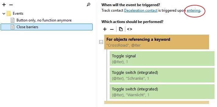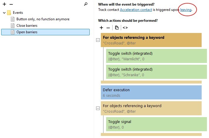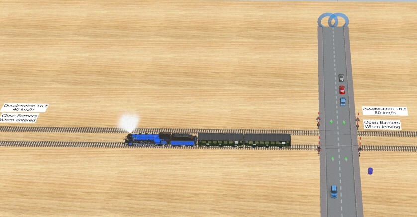 Hello @220hotwheels Pete, thanks for the support. Hello @swcurrill , Stephen. It is always ok you come back to the forum with a question. You certainly get help here. I go on with my step by step approach. And will even explain how we can get the job done with two rails later. So I prepared this next, I will come back with more. Here we go. --- First take my last layout; rename and save. Place a second rail on the crosspoint and adjust the barriers. Connect the rails by portals on both sides. ---- Place a deceleration contact long before the crossing ( 3D models – Online Catalog – Keywords – Track Contact ) Open the properties of that contact, change to Decelerate to 40 km/h. We want only one side of the contact to work, so use the correct side. This is only to decelerate the incoming train, so the barriers have all the time to close. ( the further the contact, the less you need this, even a normal TrCt can be used ) Code for the deceleration contact. Right click on that contact and choose events, new, track contact is triggered. If the train triggers this contact when entering the barriers should close. Go to the code already there for opening/closing the barriers (button). The closing is the second part of the condition. Clik left on “For objects referencing a keyword” hold down the left mouse button and drag this to your new event. Change the name of the event in Close Barriers, and done. Did you see by moving the title, the inner part of the repetition moves also. ---- Place an acceleration contact on the rail just after the crossing. This is default on Accelerate to 80 km/h, leave it like that for now. If you did not use the deceleration before, a normal TrCt could do the job also. Code for the acceleration contact. Right click on that contact and choose events, new, track contact is triggered. If the train triggers this contact when leaving the barriers should open. Go to the code for opening/closing the barriers (button). The opening of the barriers is the first part of the condition. This time you have to move the "for" (brown), the time delay (blue) and the second "for" in that order to your new event. Change the name of the event in Open Barriers, and done. Put a train on the rails and test. For now only one side is working. Kind regards Herman Stephen 03 Barriers.mbp That's a pity, said a nearly 75 years old Herman. Posted this and then saw your decision later. I respect your decision. The 3D studio has so much to learn, and the learning curve is steep and takes a lot of time. But it is worth learning. Have a nice sunday, Some advice: Start with little things on an empty layout and try them out. Problems with German, use Google or Deepl translate to look something up. Always try out the possibilities of objects manual, before programming in the EV.