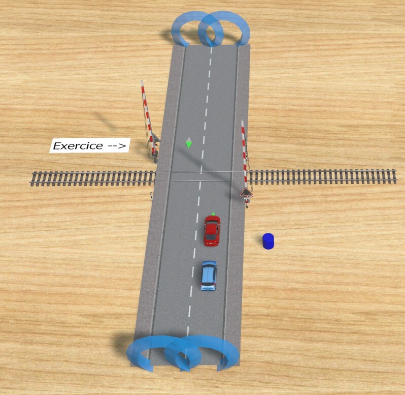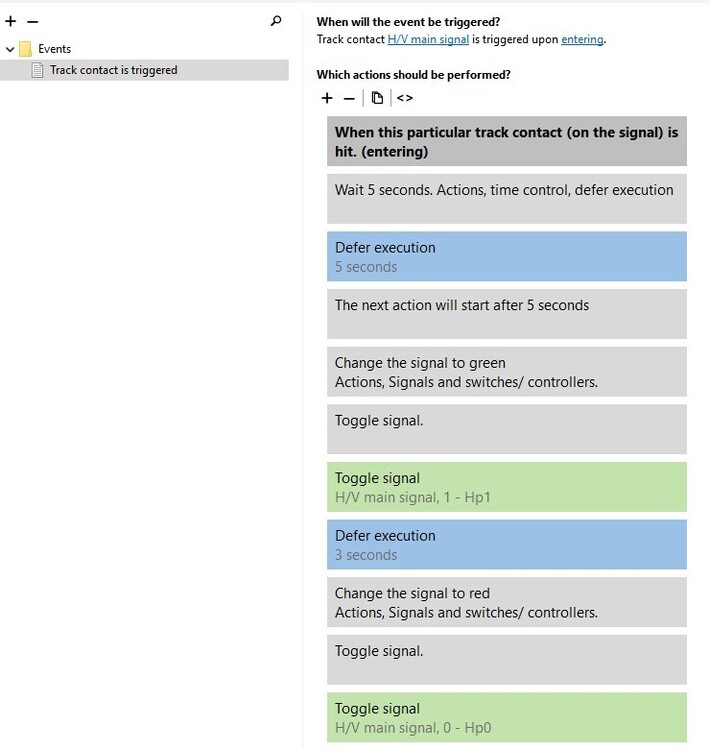 12. Hello @220hotwheels Pete, thanks for the support. Hello @swcurrill , Stephen. It is always ok you come back to the forum with a question. You certainly get help here. I go on with my step by step approach. And will even explain how we can get the job done with two rails later. So I prepared this next, I will come back with more. Here we go. --- First take my last layout; rename and save. Place a second rail on the crosspoint and adjust the barriers. Connect the rails by portals on both sides. ---- Place a deceleration contact long before the crossing ( 3D models – Online Catalog – Keywords – Track Contact ) Open the properties of that contact, change to Decelerate to 40 km/h. We want only one side of the contact to work, so use the correct side. This is only to decelerate the incoming train, so the barriers have all the time to close. ( the further the contact, the less you need this, even a normal TrCt can be used ) Code for the deceleration contact. Right click on that contact and choose events, new, track contact is triggered. If the train triggers this contact when entering the barriers should close. Go to the code already there for opening/closing the barriers (button). The closing is the second part of the condition. Clik left on “For objects referencing a keyword” hold down the left mouse button and drag this to your new event. Change the name of the event in Close Barriers, and done. Did you see by moving the title, the inner part of the repetition moves also. ---- Place an acceleration contact on the rail just after the crossing. This is default on Accelerate to 80 km/h, leave it like that for now. If you did not use the deceleration before, a normal TrCt could do the job also. Code for the acceleration contact. Right click on that contact and choose events, new, track contact is triggered. If the train triggers this contact when leaving the barriers should open. Go to the code for opening/closing the barriers (button). The opening of the barriers is the first part of the condition. This time you have to move the "for" (brown), the time delay (blue) and the second "for" in that order to your new event. Change the name of the event in Open Barriers, and done. Put a train on the rails and test. For now only one side is working. Kind regards Herman Stephen 03 Barriers.mbp That's a pity, said a nearly 75 years old Herman. Posted this and then saw your decision later. I respect your decision. The 3D studio has so much to learn, and the learning curve is steep and takes a lot of time. But it is worth learning. Have a nice sunday, Some advice: Start with little things on an empty layout and try them out. Problems with German, use Google or Deepl translate to look something up. Always try out the possibilities of objects manual, before programming in the EV.