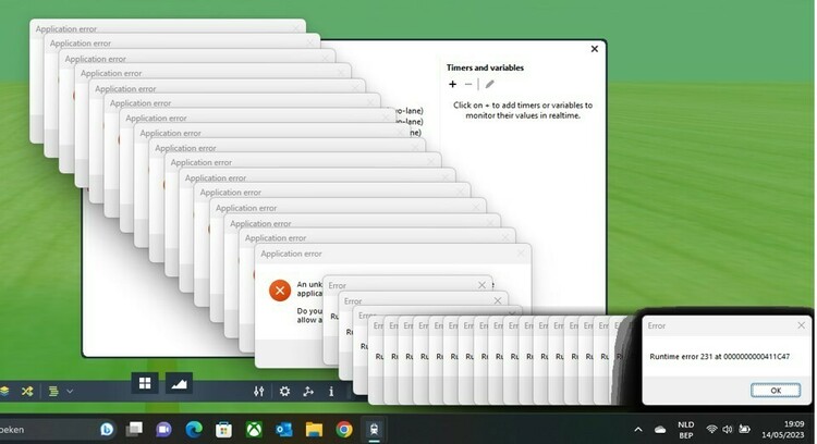 error cockpit camera used.mbp Hello, I came in multiple errors that killed the runtime of V8. Here a little layout to provoke it. Some help please. This layout can run for a long time at high speed without error. Now, put for one of the bikers the cockpit camera on. When he/she dissapears to the depot, this error may occur. ( if there are bikes waiting at the collision point ) There is nothing wrong with the code sending to depot or the code for releasing out of the depot, because : when we set the code for the collision ( red track contact ) off, then there is no error at all. So in that case the bike can dissapear in the depot with the cockpit camera on, no problem. Hallo, ich bin auf mehrere Fehler gestoßen, die die Laufzeit von V8 beeinträchtigt haben. Hier ein kleines Layout, um es zu provozieren. Bitte um Hilfe. Dieses Layout kann lange Zeit fehlerfrei mit hoher Geschwindigkeit laufen. Jetzt schalten Sie für einen der Biker die Cockpit-Kamera ein. Wenn er/sie im Depot verschwindet, kann dieser Fehler auftreten. (wenn Fahrräder am Kollisionspunkt warten) Es ist nichts Falsches daran, den Code zum Senden an das Depot oder den Code zum Freigeben aus dem Depot zu verwenden, denn: Wenn wir den Code für die Kollision (roter Gleiskontakt) ausschalten, liegt überhaupt kein Fehler vor. In diesem Fall kann das Fahrrad also problemlos mit eingeschalteter Cockpitkamera im Depot verschwinden. Regards, Herman