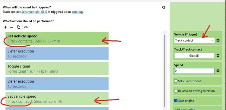Hello @norbert_janssen , you have to change this when starting a vehicle. Hallo @ norbert_janssen , das muss man beim Starten eines Fahrzeugs ändern. The trigger has to be a Vehicle, not a track contact to give it a speed. Der Auslöser muss ein Fahrzeug sein, nicht ein Gleiskontakt, um ihm eine Geschwindigkeit zu geben. Further I do not fully understand your wish, nor have the time at the moment, so I leave finding a solution to our German speaking members. Außerdem kann ich Ihren Wunsch nicht ganz nachvollziehen und habe im Moment auch nicht die Zeit dazu, so dass ich die Suche nach einer Lösung unseren deutschsprachigen Mitgliedern überlasse. Kind regards, Herman