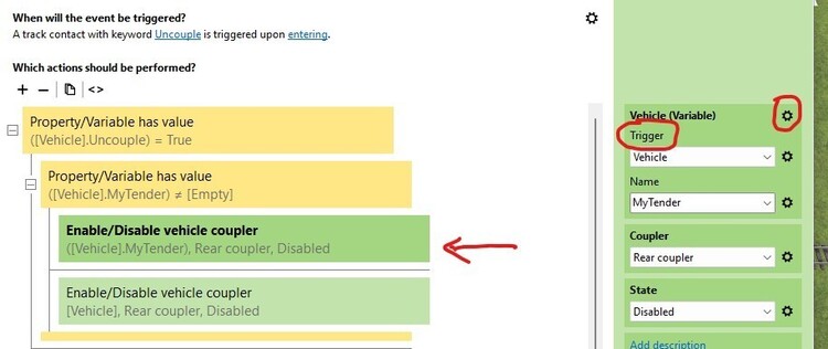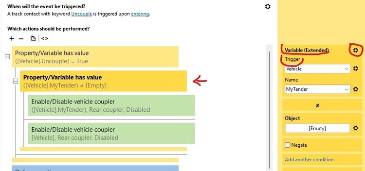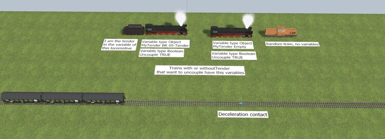 Hello everybody. Take the solution from @EASY , wich I want to thank him for working it out in a more comprehensive way. Uncouple3a.mdb above. Hallo zusammen. Nehme die Lösung von @EASY , dem ich für die Ausarbeitung der Lösung in einer umfassenderen Weise danken möchte. Because if the variable does not exists, nothing happens. If the variable exist he will take what is in the variable : the tender / or the locomotive to uncouple. Denn wenn die Variable nicht vorhanden ist, passiert nichts. Wenn die Variable existiert, wird er das nehmen, was in der Variable steht: den Tender / oder die Lokomotive zum Abkoppeln. Kind regards, and thanks again Easy. Herman There is his suggestion to give the variable the name "Uncouple" and to fill in the tender or the locomotive. Er schlägt vor, der Variablen den Namen „Uncouple“ zu geben und den Tender oder die Lokomotive einzutragen.