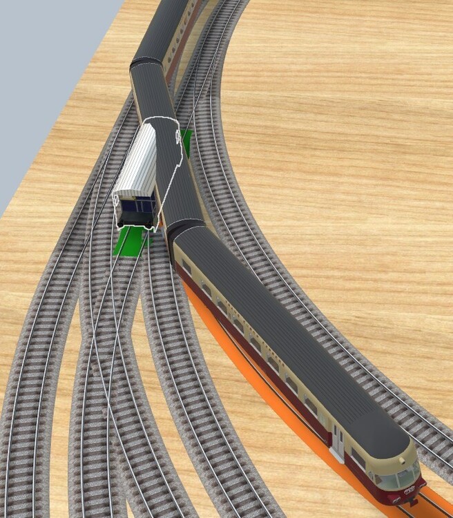 Hello @Hawkeye , as far as I can see, the green track contact is triggered before the red train is on the track switch. So the route is activated when triggering. Or am I wrong ? Of course if you push the blue one a little forward, he is on the track switch already when the red one arrives. Hallo @Hawkeye , soweit ich das sehen kann, wird der grüne Gleiskontakt ausgelöst, bevor der rote Zug auf der Weiche steht. Also wird die Strecke beim Auslösen aktiviert. Oder liege ich da falsch ? Wenn man den blauen etwas nach vorne schiebt, ist er natürlich schon auf der Weiche, wenn der rote ankommt. Regards Herman