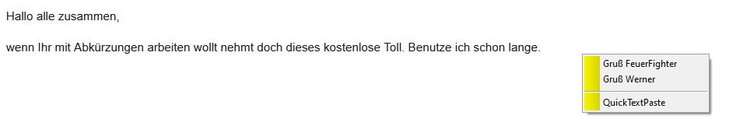 Hallo alle zusammen, wenn Ihr mit Abkürzungen arbeiten wollt nehmt doch dieses kostenlose Toll. Benutze ich schon lange. Man kann beliebig viele Textbausteine hinterlegen. Gruß FeuerFighter