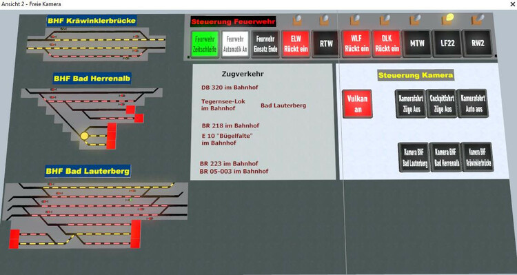 22. Hallo alle zusammen ich habe noch ein paar Bilder von meiner im Bau befindlichen Anlage für Euch. Außerdem wünsche ich allen ein frohes Weihnachtsfest und einen guten Start ins neue Jahr. Bleibt alle gesund und weiter voller Tatenkraft das Wünsche ich Euch von ganzen Herzen. Abschließend möchte ich noch sagen: Neo es ist ein tolles 3D Modellbaustudio geworden das jedem etwas zu bieten hat. Danke. Gruß FeuerFighter Die Anlage in voller Größe Meine Steuerzentrale (Auch noch im Bau befindlich). Bei der Zuganzeige ist es so: Grün=unterwegs - Dunkelrot = Anfahrt Bahnhof und wenn der Zug steht erscheint der Bahnhofsname. Außerdem gibt es die Kamerafahrten der Züge und Autos sowie die Cockpitfahrt, auch können die Bahnhöfe über Kameraperspektiven angesehen werden. Die Steuerung der Feuerwehr läuft automatisch alle 5 Minuten ab. Das Lämpchen über dem LF22 zeigt mir das dieses Fahrzeug noch unterwegs ist. Ich habe es so gemacht das man auf die Schalter der Steuerung Feuerwehr nicht zugreifen kann. Das alles ist ohne Lua gemacht, wobei es mit Lua sicherlich noch mehr Möglichkeiten geben würde. Ich glaube aber dass die wenigsten sich mit Lua auskennen und ich die Anlage wenn sie fertig ist auch hoch laden möchte so dass Jeder sie nach seinen Wünschen ändern kann.