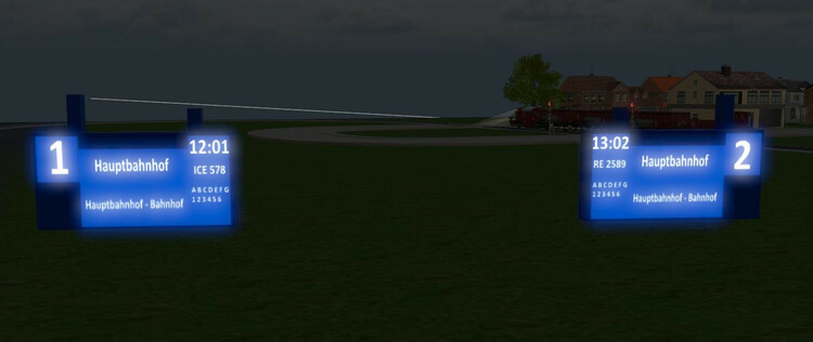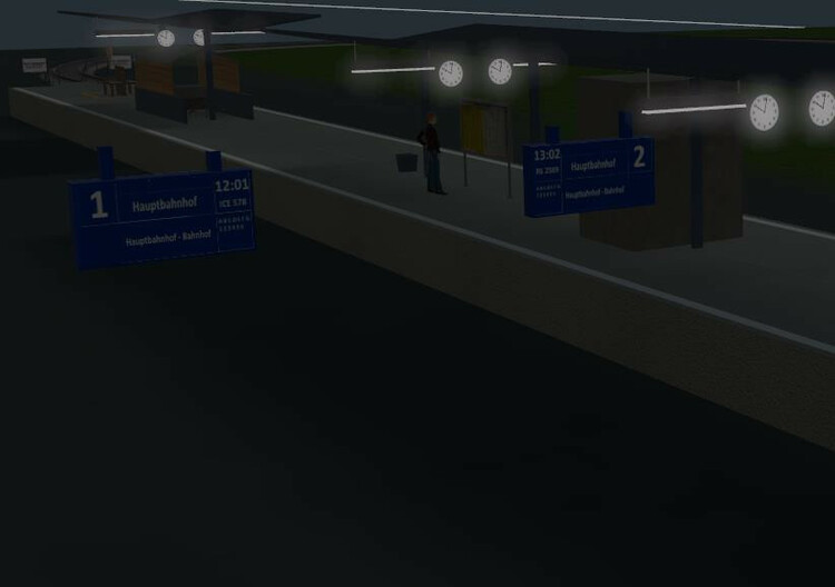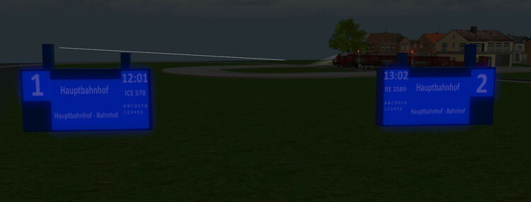 16. Hallo alle zusammen das nächste Modell ist fertig. Es ist eine Zuganzeige welche man dazwischen setzen kann. Da die Zuganzeige eine Tauschtextur besitzt kann ich sie leider nicht beleuchten. Es geht nur entweder Licht oder Tauschtextur. Ich habe mich für die Tauschtextur entschieden da man so die Gleisnummern und alles andere ändern kann. Außerdem habe ich bei allen Modellen das Licht noch mal gedimmt. Gruß FeuerFighter