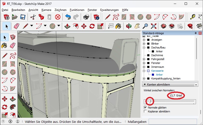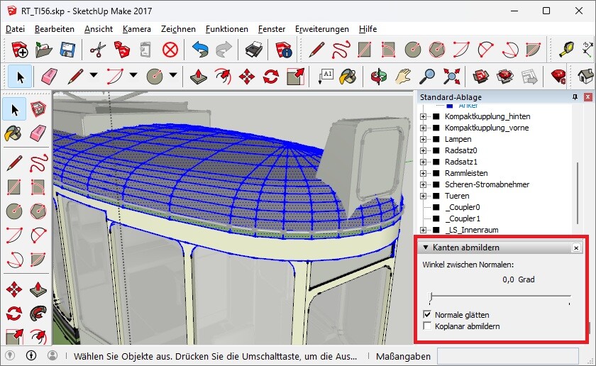 Hallo, In Sketchup ist dies die "Kantenglättung" oder "Abmilderung der Kanten". Hierzu markiert man die Kanten, die man entfernen möchte, und zieht im Konfigurationsabschnitt "Kanten abmildern" ... ... den Schieberegler so weit nach rechts, bis die zu entfernenden Kanten verschwinden. Der darüber angegebene Winkel zeigt an, bis zu welchem "Knickwinkel" einschließlich die Kanten "wegretuschiert" werden. Aber Achtung! Der Schieberegler sollte nicht zu weit nach rechts verschoben werden (also nicht einfach 90° einstellen). Denn übertreibt man es mit der Knickwinkel-Glättung (vor allem da, wo auch kleinere Winkel völlig ausreichen), kann dies zu Farb-Artefakten (Schatten-artige Farbverschiebungen) führen (hiermit sind nicht die von @Goetz hier beschriebenen Schatten-Artefakte gemeint). Einzelne Kanten können auch bei gedrückter <Strg>-Taste mit dem Radierer durch Antippen oder Überstreichen entfernt werden. Hinweis: Während die Glättung der Kanten direkt über deren Auswahl funktioniert, kann die Wiederherstellung der Kanten (z.B. für eine durchzuführende Korrektur) nur auf Gruppen angewendet werden. Möchte man also eine bestimmte Menge von Kanten wieder sichtbar machen, müssen diese Teil einer Gruppe sein (oder extra zu einer Gruppe zusammengefasst werden). Die "Glättungsstärke" kann dann komplett für die gesamte (markierte) Gruppe eingestellt werden, wobei die Schieberegler-Stellung ganz links (0,0 Grad) zur vollständigen Aufhebung der Glättung (also zur Wiederherstellung aller Kanten innerhalb dieser Gruppe) führt. Wie @Goetz bereits erwähnt hat, hat das Kantenglätten in Sketchup keinen Einfluss auf die Polygonzahl (die Polygone sind immer noch dieselben, nur die Ausrichtung der Normalenvektoren entlang dieser Kanten hat sich geändert). Viele Grüße BahnLand