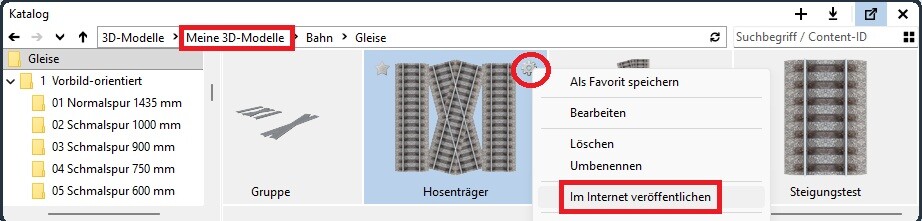 Hallo @Leslie, die von Dir genannte Content-ID referenziert nicht das Modell des in Deinem Bild gezeigten Piko-Signals, sondern die Anlage, in der Du das Signal platziert hast. Dass das Signal auch bei anderen Benutzern erfolgreich angezeigt werden kann, liegt daran, dass es aus anderen Modellen aus dem Online-Katalog zusammengesetzt ist (1x "Beeteinfassung" von Brummi und 2x "Universal An- und Ausschalter" von Feuerfighter). Diese Modelle hast Du als Gruppe zusammengefasst und dann wohl als neues Modell (als Piko-Signal) in Deinen lokalen Teil des Katalogs eingefügt (dies schließe ich zumindest aus dem Umstand, dass dieses Signal eine Content-ID besitzt: FEDAAA35-F7FA-4D2D-9309-FA94C00AF7B9). Wenn ich diese Content-ID im Suchfeld der Katalogvorschau eintrage, wird allerdings nichts angezeigt. Hieraus schließe ich wiederum, dass Du das Modell nicht veröffentlicht hast. Ob dies bei einem Modell, das aus anderen im Online-Katalog vorhandenen Modellen zusammengesetzt ist, überhaupt möglich ist, weiß ich allerdings nicht. Viele Grüße BahnLand