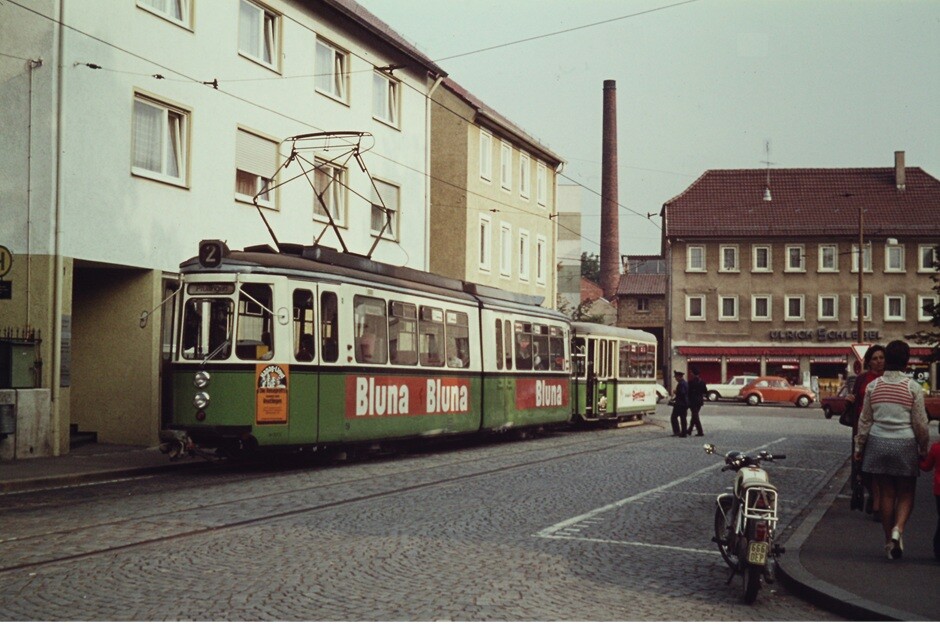 Hallo Alex, leider hatte ich seinerzeit. als ich die Straßenbahnen fotografierte, im Wesentlichen nur ein Auge für die Fahrzeuge. Was auf meinen Bildern an Oberleitung zu sehen ist, ist also eher durch "Zufall" festgehalten. Wie auch auf dem obigen Bild von Walter zu sehen ist, bestehen die Oberleitungen in den Städten im Wesentlichen aus Spann- und Tragseilen, die an den Hauswänden, anderen Gebäudeteilen oder separaten Masten befestigt sind, und den Fahrleitungen, die unter den Tragseilen aufgehängt sind. Auf diesem Bild an der ehemaligen Endstation der Reutlinger Straßenbahn in Pfullingen sieht man links eine Befestigung des Tragseils direkt an der Hauswand und rechts im Hintergrund an einem Masten. Im Reutlinger Straßenbahndepot in Eningen waren die Tragseile quer zu den Zufahrts- und Abstellgleisen an Gittermasten befestigt. Bei der Stuttgarter Straßenbahn war an den großen Kreuzungen das Netz von Spann- und Tragseilen zwischen Beton-Masten gespannt, an denen die sich teilweise kreuzenden Fahrleitungen aufgehängt waren. Bei der Stuttgarter Stadtbahn ist dies auf den oberirdischen Strecken da, wo aus Platzgründen keine Masten mit Ausleger aufgestellt werden können, auch heute noch so. Viele Grüße BahnLand