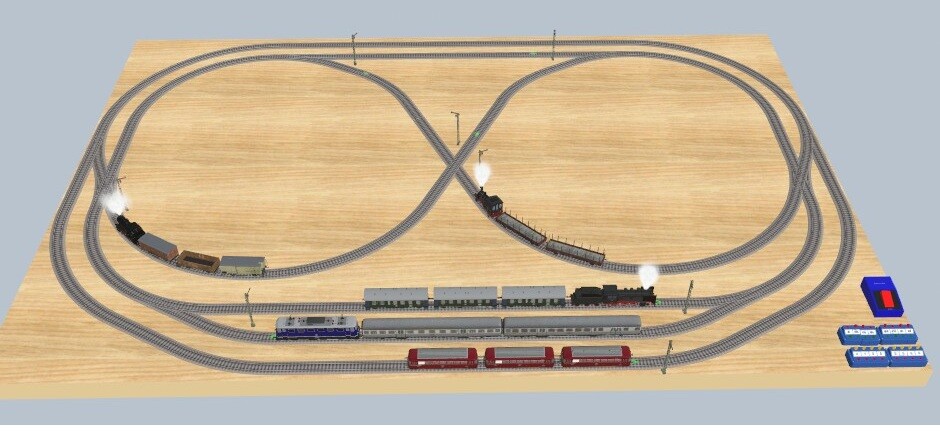 Hallo @Modellbahnspass, der Gleisplan Deiner oben gezeigten Anlage erinnert mich sehr stark an die flache Märklin-Anlage von meinem Bruder und mir aus unserer Jugendzeit. Den Gleisplan hatte ich im Dezember 2012 im Vorgänger-Forum veröffentlicht, das noch zum alten 3D-Eisenbahnplaner gehörte. Deshalb kann ich den damaligen Beitrag nicht mehr verlinken. Die Anlage hatte als Gleisbild ebenfalls eine "8", die jedoch auf einem Brett der Größe 2,00 m x 1,40 m innerhalb von 2 vollständigen Ovalen angesiedelt war. In einem Beitrag vom Januar 2017 hatte ich dann ein paar Fotos dieser Anlage veröffentlicht. Die Anlage erlaubte mit mittels Stellpulten abschaltbaren Gleisstücken die Steuerung von 5 Zügen mit einem Trafo, der grundsätzlich auf "Vollgas" stand. Der Schienenbus und der D-Zug mit der blauen E 41 fuhren auf den beiden parallelen Ovalen. Die 3 Dampfzüge fuhren fuhren quasi im "Blockabstand" auf einer verschlungenen "8" hintereinander her, wobei sie im hinteren Teil der Anlage das äußere Gleis entgegen der Fahrtrichtung des Schienenbusses benutzten. Alle Weichen waren fest eingestellt und funktionierten mit den gefederten Weichenzungen als Rückfallweichen, wenn sie vom durchfahrenden Zug "aufgeschlitzt" wurden. Die Kreuzungsweichen waren konstant auf "Geradeausfahrt" eingestellt. Dadurch konnte der 5-Zug betrieb ausschließlich durch An- und Abschalten der "Haltegleise" über die angeschlossenen Schaltpulte gesteuert werden, ohne dass jemals eine Weiche oder Kreuzungsweiche umgestellt werden musste. Wenn Onkel und Tanten an Weihnachten zu Besuch kamen (nur in den Weihnachtsferien war die Anlage aufgestellt) , mussten sie unbedingt unsere Anlage anschauen. Die haben sich dann immer erschrocken, wenn die Züge auf einander zugerast sind und dann kurz vor dem Zusammenstoß angehalten haben. Brezel-Anlage.mbp In der beigefügten Anlage habe ich das Szenario für das Modellbahn-Studio nachgestellt. Anstelle des Trafos habe ich rechts einen "Hauptschalter" platziert, über den die Anlage gestartet und wieder angehalten werden kann. Nach dem Ausschalten fahren die Züge noch so lange weiter, bis sie auf den Gleisen der Ausgangskonstellation angekommen sind. Das "An- und Abschalten" der Haltegleise wird über die verbundenen Schaltpulte nachempfunden (tatsächlich erfolgt die Steuerung im Modellbahn-Studio über Fahrstraßen). Im Gegensatz zur Original-Anlage, wo die Weichenstellpulte (und damit die Weichen) nicht betätigt wurden (es wurden nur die federnden Weichenzungen "aufgeschlitzt") werden bei der MBS-Anlage mit der Fahrstraßen-Aktivierung auch die Weichen (und die verbundenen Weichenstellpulte) entsprechend gestellt. Im 3D-Eisenbahnplaner, mit dem Du ja Deine Anlagen kreierst, kannst Du diese Anlage allerdings nicht anschauen. Du kannst aber neben dem 3D-Eisenbahnplaner zusätzlich die kostenlose Light-Version des Modellbahn-Studios (es muss V9 sein!) installieren, ohne dass hierdurch Deine 3DEP-Installaton beeinträchtigt wird. Dann kannst Du die Anlage importieren und den Betriebsablauf der Anlage im MBS betrachten. Wenn Du Lust hast, kannst Du die Anlage im 3DEP dann immer noch nachbauen (das Märklin-M-Gleis-Sortiment ist ja im 3DEP vorhanden). Viele Grüße BahnLand