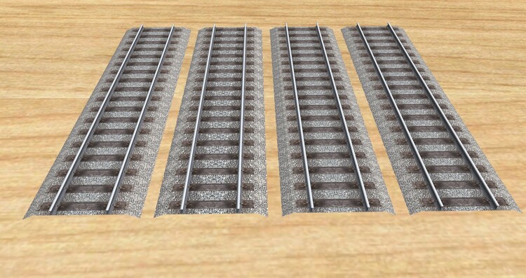 11. Hallo Rainer, bei sämtlichen Gleisstücken aus der Kategorie "Verkehrswege\Gleise\Vorbild-orientiert" verwende ich dieselbe Gleistextur. Dadurch ist es möglich, für alle Gleise aus dieser Kategorie die Gleistexturen aus dem Online-Texturen-Katalog als Tauschtexturen einzusetzen. Dies gilt insbesondere für die Variation "X03 Kiesbett ohne Schwellen". Die Gleistextur besitzt das oben abgebildete Layout, wobei mit dem linken Teil das Gleisbett und mit dem rechten Teil die Schienen texturiert werden. Für die "normalen" Gleise ist neben der Kiesbettung auch die Schwelle enthalten. Da bei der Variation "X03 Kiesbett ohne Schwellen" keine Schwelle dargestellt werden soll, muss hier die Textur auf das Sketchup-Modell so aufgetragen werden, dass die Schwelle nicht mehr sichtbar ist. Dies wurde dadurch erreicht, dass von beiden Gleis-Enden des Modells her die Gleistextur soweit auseinander gezogen wurde, dass sich die Texturbereiche mit dem Schotter in der Mitte treffen und damit der Bereich mit der Schwelle nicht wirksam wird. Dies ist die Ursache für die Verdoppelung der Schottergröße in Richtung der Gleisachse. Der Grund für die Verwendung dieser Methode lag in der Absicht, die Anzahl der Trennkanten, wo die sich gegenüber liegenden Schottersteine nicht zusammen passen, zu minimieren. Möchte man die Vergrößerung der Schottersteine durch die Dehnung der Gleistextur vermeiden, muss man die Bereiche mit der Schwelle mit Kopien der Bereiche ohne Schwelle übermalen, wobei dann jedoch die im vorherigen Bild vermiedenen zusätzlichen Trennkanten (in beiden Bildern jeweils rot eingezeichnet) mit nicht zusammenpassenden Schottersteinen auftreten. Um diese Texturierung zu realisieren, muss jedoch die Gleisbett-Oberfläche des Sketchup-Modells weiter unterteilt und entsprechend neu texturiert werden. Denn die Textur selbst kann ja nicht verändert werden, wenn weiterhin die Möglichkeit bestehen soll, auch hier die Tauschtexturen aus dem Online-Katalog anzuwenden. Ich habe probeweise ein Gleismodell erzeugt, bei dem die aufgetragene Textur die Darstellung aus dem letzten Bild zeigt, daraus ein einfaches Gleis und eine doppelte Kreuzungsweiche erzeugt und diese bisher möglichen Darstellungen gegenüber gestellt: Dieses und das nächste Bild können durch Anklicken vergrößert werden. Auf dem obigen Bild sind 4 Gleisstücke zu sehen, wobei das linke die Variation "G01 Gleis mit Bettung" ist. Bei den anderen 3 Gleisen ist der Variation "G02 Gleis mit breiten Schwellen" jeweils ein Gleisbett unterlegt, das gegenüber dem Gleis um 0,2 mm abgesenkt ist (bezogen auf den Maßstab H0), um die Schwellen etwas hervorstehen zu lassen. Gleis 2 von links enthält hierbei das Gleisbett "X03 Kiesbett ohne Schwellen" mit den vergrößerten Schottersteinen, Gleis 3 das neue Kiesbett ohne Schwellen mit nun nicht mehr vergrößerten Schottersteinen und Gleis 4 das Gleisbett "X02 Gleisbett ohne Schienen", bei dem die Schwellen im Gleisbett zwar vorhanden sind, aber von den Schwellen des darüber liegenden Gleises (weitgehend) verdeckt werden. Da hier die Schwellen im Gleismodell beibehalten wurden, ist auch für die Schottersteine die Originalgröße erhalten geblieben. Das letzte Bild zeigt anstatt der geraden Gleisstücke doppelte Kreuzungsweichen, die von links nach rechts analog zu den Gleisstücken im vorherigen Bild erstellt wurden. Allerdings wurden hier anstatt der Variation "G02 Gleis mit breiten Schwellen" die Variationen "X01 Schienen ohne Unterbau" und "X04 Schwellenband breit" hergenommen, um die Schwellenbänder der geraden Stränge wie hier im zweiten Bild gezeigt entfernen zu können (das wurde auch mit den Gleisbetten so gemacht). Um die Texturierung der Variation "X03 Kiesbett ohne Schwellen" generell auf die kleine Schotter-Körnung umzustellen, müsste ich sämtliche Gleisstücke in allen Teil-Sortimenten der Kategorie "Verkehrswege\Gleise\Vorbild-orientiert", welche diese Gleisbett-Variation anbieten, anpassen. Das würde ich gerne vermeiden. Deshalb möchte ich vorschlagen, für die Absenkung des Gleisbetts unter dem Schwellengleis anstelle der Variation "X03 Kiesbett ohne Schwellen" (Gleis 2 von links) die Variation "X02 Gleisbett ohne Schienen" (Gleis 4) herzunehmen und das leichte Hervorschimmern der im Gleisbett enthaltenen Schwelle unter der Schwelle des darüber gelegten Schwellengleises (oder Schwellenbands) in Kauf zu nehmen. Viele Grüße BahnLand