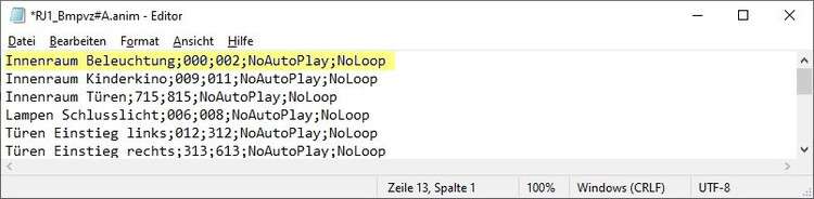Hallo Walter, siehe hier. In dem über den dortigen Link erreichbarem Dokument beschreibt das Kapitel 2.4 genau diese Problematik und die Lösung dazu. Ich vermute, dass beim Vorbild die Liniennummer auf einer "ebenen" Fläche "hinter Gas" aufgebracht ist. Ich hätte daher wie beim Vorbild hinter der (gebogenen) Glasscheibe eine ebene schräg ausgerichtete Fläche platziert, auf die dann der Texturbereich mit der Nummer aufgetragen wird. Damit wäre das Problem mit dem Auftragen der Textur auf eine zylindrische Fläche nicht entstanden. Die Definition des "variablen" Textbereichs auf der Textur erfolgt dann "wie gehabt". Das Bremslicht kannst Du mit der EV nur über ein "Ereignis" ein- oder ausschalten. Veranlasst man das Bremsen durch einen Gleiskontakt "direkt beim Passieren" (Gleiskontakt nicht als "Bremskontakt" konfiguriert), kann der Gleiskontakt als "Ereignisgeber" verwendet werden ("Gleiskontakt wird ausgelöst"). Ist der Kontakt jedoch als Brems- und/oder Beschleunigungskontakt konfiguriert, leitet das Modellbahn-Studio selbsttätig die Abbremsung oder Beschleunigung bereits vor dem Erreichen des Gleiskontakts ein, sodass die eingestellte "Zielgeschwindigkeit" bei de rAnkunft am Gleiskontakt bereits erreicht ist. In diesem Fall ist es (heute) nicht möglich, die Bremslichter entsprechend anzuschalten, weil es ein entsprechendes EV-Ereignis "Beginn des Brems- oder Beschleunigungsvorgangs, initiiert durch einen voraus-liegenden Gleiskontakt" nicht gibt (@Neo: wäre es möglich, Ereignisse der Form "Abbremsung gestartet", "Beschleunigung gestartet", "Zielgeschwindigkeit erreicht" bereitzustellen?). Das Ausschalten des Bremslichts nach dem Anhalten des Fahrzeugs ist dagegen heute schon möglich ("Fahrzeug stoppt"). Du bekommst die Überbelichtung weg, wenn Du auf der "Basis"-Textur jene Bereiche schwarz färbst, die auf der Emissive-Textur als leuchtend definiert (als nicht schwarz) sind. Ich würde aber mit der Beleuchtung das neue Feature in V9 abwarten, da dieses die Realisierung der Beleuchtungseffekte deutlich vereinfachen soll. Viele Grüße BahnLand
