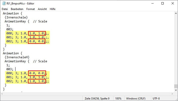 Hallo Walter, ein in Sketchup zu animierendes Bauteil ist immer eine Gruppe. Denn das zu animierende Bauteil besteht normalerweise aus mehreren Flächen, die mittels der Animation zusammen (das gesamte Bauteil eben) skaliert, gedreht und/oder verschoben werden soll. Und da wendet man die Animation dann eben auf diese Gruppe an (Du kannst in der AnimationSet-Definition nur Frames adressieren, und diese entsprechen den Sketchup-Gruppen). Ein Bauteil, das mittels einer Animation skaliert werden soll (z.B. um es ein oder auszublenden), wird in Sketchup immer im eingeblendeten Zustand (als "ausgefahren") gebaut. Erst in der Spezifikation der AnimationSet-Definition wird festgelegt, ob das Bauteil in der Ausgangsstellung ausgefahren (sichtbar, Skalierungsfaktor 1) oder eingefahren (unsichtbar, Skalierungsfaktor 0) sein soll. Hierzu folgendes Beispiel: Bei den Railjet-Wagen gibt es das Bauteil "Innenschale" (das sind die Innenwände des Fahrgastraums) 2-mal, nämlich als "normales" Bauteil bei Tageslicht und als "beleuchtetes" Bauteil für die nächtliche Innenbeleuchtung ("InnenschaleH" für "Hell", Emissive). Die gegenläufige Ein- und Ausblendung beider Bauteile erfolgt über den Abschnitt "Innenraum Beleuchtung" in der Anim-Datei (Positionen 0-2 in der "Timeline"). Beim Einschalten der Innenraum-Beleuchtung soll die "Tageslicht"-Innenschale ausgeblendet und die leuchtende "InnenschaleH" eingeblendet werden. Beim Ausschalten der Innenraum-Beleuchtung wird dann "InnenschaleH" ausgeblendet und "Innenschale" eingeblendet (Rückwärtslauf der Animation). Beide Bauteile "Innenschale" und "InnenchaleH" sind in Sketchup in "ausgefahrenem" (eingeblendetem) Zustand (Skalierungsfaktor 1) realisiert. In der AnimationSet-Definition ist für die Animation "Innenraum Beleuchtung" Position 0 der Ausgangszustand und Position 2 der Endzustand. Das Bauteil "Innenschale" ist bei ausgeschalteter Beleuchtung (Standard-Einstellung) ausgefahren (Skalierung 1), das Bauteil "InnenschaleH" in y- und z-Richtung auf 0 zusammengedrückt, also ausgeblendet (der Skalierungs-Nullpunkt befindet sich bei diesem Beispiel unterhalb des Innenraum-Fußbodens, durch ein _AP-Objekt innerhalb der Sketchup-Gruppe so festgelegt). Aufgrund der "0"-Ausdehnung von "InnenschaleH" in der Ausgangsposition der AnimationSet-Definition schiebt das Modellbahn-Studio beim Laden in der Stellung "Beleuchtung aus" das Bauteil automatisch zusammen. Wird nun die Beleuchtung eingeschaltet, wird zuerst "InnenschaleH" ausgefahren (bis zur Position 1) und ab diesem Zeitpunkt "Innenschale" zusammengeschoben. Hiermit wird vermieden, das sich beide Bauteile gleichzeitig gegenläufig bewegen und dadurch kurzzeitig "außen" eine Lücke entsteht. Lässt man die Animation "schnell genug" ablaufen (z.B. mit 100 AnimTicksPerSecond) kann man auf den mittleren Zustand verzichten und die Animationslänge auf die Positionen 0-1 reduzieren.. Ohne die AnimationSet-Steuerung würde im Modellbahn-Studio der Innenraum flimmern, weil beide Bauteile in ausgefahrenem Zustand deckungsgleich übereinander liegen würden. Viele Grüße BahnLand