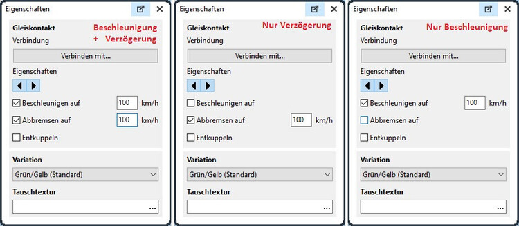 Hallo Wolfgang, Die Beschleunigung und die Abbremsung am Gleiskontakt wirken nur dann, wenn sie auch explizit eingestellt sind. Im linken Beispiel sind sowohl das Beschleunigen als auch das Abbremsen auf 100 km/h eingestellt. Damit wird bei der Annäherung ein langsamerer Zug auf 100 km/h beschleunigt und ein schnellerer Zug auf 100 km/h abgebremst. Wenn wie im mittleren Beispiel nur das Abbremsen aktiviert ist, wird zwar ein schnellerer Zug abgebremst, aber ein langsamerer Zug behält seine ursprüngliche Geschwindigkeit bei, da am Gleiskontakt die Beschleunigung nicht aktiviert ist. Genauso kann man wie im rechten Bild gezeigt veranlassen, dass ein sich nähernder langsamerer Zug auf den vorgesehenen Wert beschleunigt wird, aber ein schnellerer Zug seine höhere Geschwindigkeit beibehält. Alle 3 Beispiele kommen ohne zusätzliche Ereignissteuerung aus. Viele Grüße BahnLand
