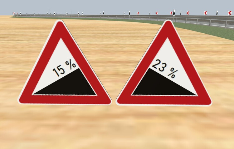 Hallo @Siejay und @Neo, ich könnte mir vorstellen, dass möglicherweise (auch) so etwas gemeint ist: Bei diesen Verkehrszeichen habe ich das Problem dadurch umgangen, dass ich das Bild auf der Textur so weit geneigt habe, dass die im Original geneigte Schrift auf der Textur horizontal ausgerichtet ist. Damit kann sie als variabel definiert und somit vom Benutzer überschrieben werden. Auf dem Verkehrszeichen-Modell wurde die aufzutragende Textur dann in Gegenrichtung um genau denselben Winkel geneigt. Da die variable Schrift auf der Textur weiterhin horizontal ausgerichtet ist, kann der auf dem Verkehrszeichen-Modell geneigte Schriftzug trotzdem "ganz normal" modifiziert werden. Die im Bild gezeigten Steigungs- und Gefälle-Verkehrszeichen sind im Modell "Verkehrsz. beschriftbar 01" (Content-ID 8C237158-8949-44B3-80F2-AC5715D3F36A) des Online-Katalogs als Variationen enthalten. Viele Grüße BahnLand