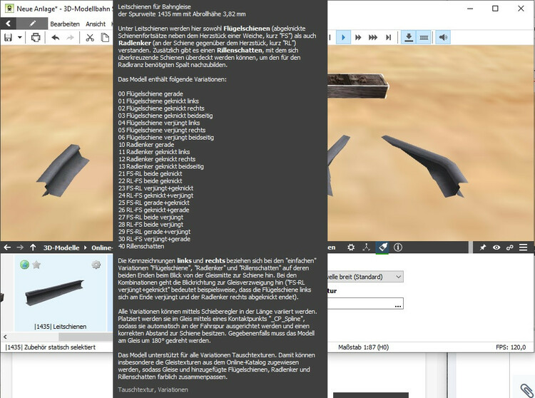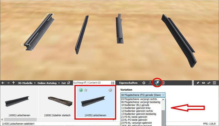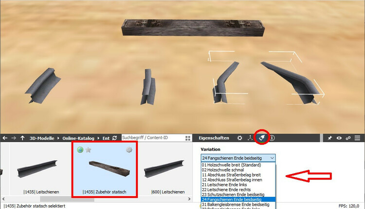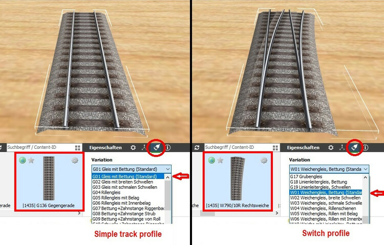 Hello Kalle, please have a look to the variations of all models from the categories "Verkehrswege\Gleise\Vorbild-orientiert\Normalspur 1435 mm" and "Verkehrswege\Gleise\Vorbild-orientiert\Zubehör". For each track, you will find different profiles as variations after clicking the brush symbol and then opening the variation list. For simple tracks, the default variation is "G01 Track with bedding" (let side in the picture above) . For switches the default variation is "W01 Switch track with bedding" (siee th pivture above at the right side), to make switch blades visible. In the same way there are also variations in the models "Leitschienen" (Guardrails) and "Zubehör statisch" (Static accessories). While the variations of the first model can be stretched along the track axis, the variations of the second model are fix. When moving the mouse over the preview image of the models regarded here, an overview about all variations of the model will be shown. The models with all variations described here are available since Train Studio V5. Many greetings BahnLand
