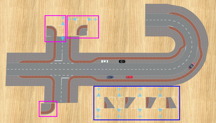 Hallo Axel, ich habe mit Deinen neuen Gehweg-Splines etwas herum gespielt. Sie sind Dir gut gelungen. (zum Vergrößern bitte anklicken) Da auch die Ausweich-Teile Splines sind, lassen sie sich auch in Kurven anwenden (wobei allerdings der Ausweichbogen in der Innenkurve bei diesem Radius etwas "verbogen" wirkt). Das Ausweichstück könnte eine" geteilte" Variante vertragen (das "Vieleck" ist in der Vergrößerung besser zu sehen). Der Kreuzungsbogen ist jedoch als Spline weniger geeignet. Denn dadurch besitzt er nur in einer Ausrichtung Kontaktpunkte (siehe die violetten Kästchen im Bild oben), sodass er nur in dieser Ausrichtung (und um 180° gedreht) an benachbarte Teile andocken kann. Außerdem darf dieses Teil als Spline nicht gestreckt oder gestaucht werden, da sich damit die Breite der Radweg-Kante und die Größe der Pflastersteine oder Gehwegplatten ändert, und damit nicht mehr mit dem benachbarten Teil zusammenpasst (siehe den violetten Kasten unten). Wofür sind die rechts die im unteren Teil des Bildes blau eingerahmten Teile gedacht? Kannst Du hierfür ein Anwendungsbeispiel zeigen? Für den Anlagenrand können sie ja nicht bestimmt sein, da die Schräge nicht über die gesamte Breite des Spline-Modells verläuft. Viele Grüße BahnLand