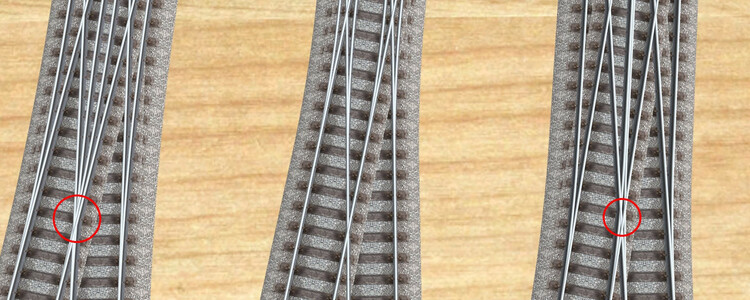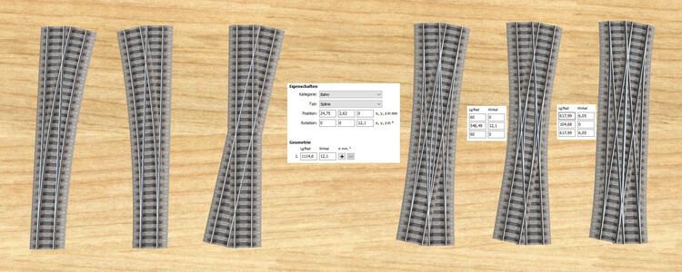 7. Hallo Frank, (beide Bilder können durch Anklicken vergrößert werden) hier ein kurzer Überblick, wie eine doppelte Kreuzungsweiche (im Bild rechts 3 Varianten) passend zu den Weichen und zur Kreuzung des Märklin-C-Gleises (großer Radius, alle links im Bild) aussehen könnte. Die linke Kreuzungsweiche entstand durch Verwendung der Gleislängen und Radien der Weichen und der Startkoordinaten aus der Kreuzung (im Bild in der Mitte sind die Daten der Spur 3 wiedergegeben). Schaut man sich diese Kreuzungsweiche etwas genauer an (unteres Bild links), erkennt man, dass die Weichenzungen ziemlich genau mit dem Herzstück der kreuzenden Geraden zusammenfallen. Dies gibt es so weder in der Realität, noch ist dies mechanisch im (Märklin-)Modell machbar. Ich habe deshalb noch zwei Varianten konstruiert, bei denen die Zungen entweder weiter nach innen verschoben sind (mittlere Variante, DKW mit innen liegenden Weichenzungen) oder nach außen in die bereits getrennten Gleisspuren verlagert wurden (rechte Variante, DKW mit außen liegenden Weichenzungen vom Typ "Baeseler"). Die rechte Variante gibt es zwar beim Vorbild, lässt sich aber in der Märklin-Geometrie ebenfalls sehr schwer nachbilden, weil die 3 Herzstücke (im roten Kreis rechts im Bild unten) und die zugehörigen Weichenzungen bei dieser Geometrie zu nahe beieinander liegen. Als einzige "realistische" Variante bleibt hier also die mittlere Variante mit den innen liegenden Weichenzungen übrig, welche aber einen zusätzlichen Radius benötigt, den Märklin bei den Produktionsmaschinen wohl nicht zusätzlich investieren wollte. Und den kleinen Parallelgleis-Radius der kleinen Weichen wollte Märklin wohl auch nicht hernehmen. Ich denke, dass dies die Gründe sind, warum es für den großen Radius neben den Weichen zwar eine Kreuzung, aber keine Kreuzungsweichen gibt. Im Modellbahn-Studio lassen sich natürlich alle Variationen realisieren, da es hier keine "mechanischen" Einschränkungen gibt. Bei der linken Kreuzungsweiche sind mit dem 3D-Modelleditor der Kreuzung einfach die beiden gebogenen Fahrspuren hinzuzufügen und bei den Weichenstellungen zu ergänzen. Als Startpunkt für die diagonal beginnende gekrümmte Fahrspur werden die Startpunkt-Koordinaten des Diagonalgleises der Kreuzung hergenommen. Der Radius und der Bogenwinkel der gekrümmten Fahrspuren stimmen mit jenen der Weichen überein. Bei den beiden DKW-Beispielen rechts ist sind die gekrümmten Fahrspuren jeweils dreigeteilt, wobei beim mittleren Beispiel der in der Mitte definierte Gleisbogen von 2 geraden Gleisabschnitten flankiert wird. Beim Beispiel ganz rechts ist es genau umgekehrt: außen befinden sich 2 Kurvenstücke, die einen geraden Gleisabschnitt in der Mitte umschließen. Alle eingeblendeten Spur-Definitonen im oberen Bild beziehen sich jeweils auf die Spur 3 der zugehörigen Kreuzungsweiche. Mithilfe dieser Beschreibung sollte es Dir möglich sein, mittels des 3D-Modellleditors die gewünschten Kreuzungsweichen selbst nachzubauen. Viele Grüße BahnLand