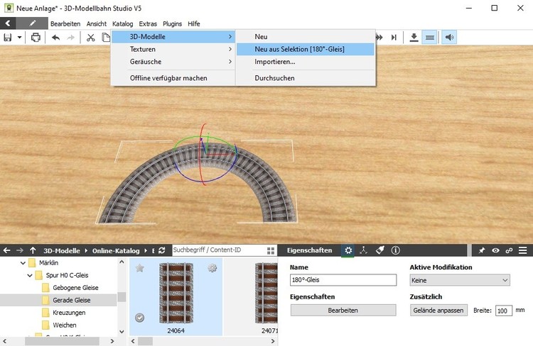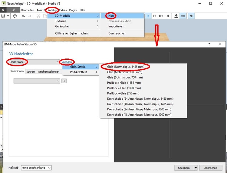 Hsll @siggi, zunächst herzlich willkommen beim Modellbahn-Studio und im Forum. @Neo stellt im Modellbahn-Studio allgemein verfügbare Gleisprofile zur Verfügung, mit denen jeder Benutzer des Modellbahn-Studios eigene Gleise entwerfen und im Katalog abspeichern und veröffentlichen kann. Auf diese Weise entstanden auch die von @Henry im Online-Katalog bereitgestellten Gleissysteme der Modellgleis-Hersteller. Da diese Gleisprofile jedem Nutzer des Modellbahn-Studios zur freien Verwendung zur Verfügung stehen, ist es auch möglich, neben dem Kreieren völlig neuer Gleis-Geometrien nach der oben gezeigten Vorgehensweise auch solche bereits existierende Gleise auf der Anlage mit dem 3D-Modelleditor zu modifizieren und dann als neue Varianten mit der Methode "Neu aus Selektion" in den Katalog einzufügen. Dies funktioniert allerdings nur mit den Gleisen, die auf diesen "Standard"-Gleisprofilen basieren. Aus Deiner obigen Aussage schließe ich daher, dass es sich bei dem Ursprungsgleisstück, das Du modifziert im Katalog abgelegt hast, genau um ein solches von @Henry veröffentlichtes Gleisstück gehandelt hat. Gleise aus dem Online-Katalog, die auf von anderen Benutzern bereitgestellten Gleisprofilen basieren, können zwar ebenfalls mit dem Gleiseditor modifiziert und dann auf eigenen Anagen verwendet werden. Man kann sie aber nicht als neue Modelle in den Katalog einfügen, weil die Gleisprofile eben von anderen Autoren stammen und daher nicht zum "Grundausbau" des Modellbahn-Studios gehören. Dies trifft auch insbesondere auf die Spline-Straßen zu, weshalb Du Deine Straßen-Sperrweiche nicht im Katalog ablegen kannst. Du kannst aber stattdessen solche selbst kreierten "Fahrbahnstücke" auf eine spezielle Anlage mit beispielsweise dem Namen "Gleis- und Straßenlager" ablegen, die Du dann immer mittels "Bearbeiten - Einfügen aus - Anlage ..." in die gerade in Bearbeitung befindliche Anlage einfügen kannst. Damit stehen dann diese eigenen Gleis- und Straßenstücke mittels "Copy&Paste" in Deiner neuen Anlage zur Verfügung. Auch das Veröffentlichen der Anlage ist dann im Nachhinein kein Problem, weil ja alle modifizierten Gleisstücke auf Gleisprofilen beruhen, die alle schon im offiziellen Online-Katalog vorhanden sind. Viele Grüße BahnLand