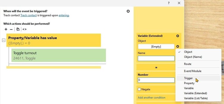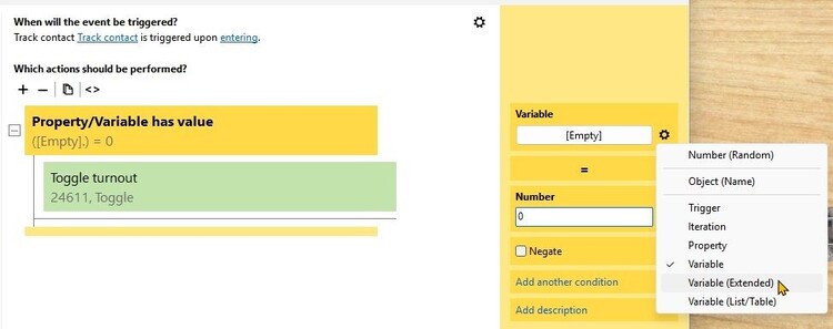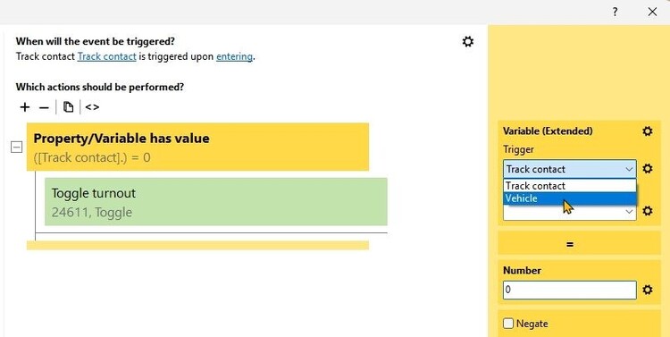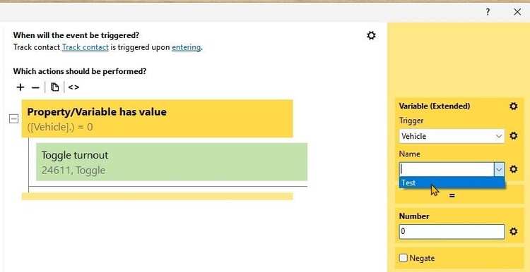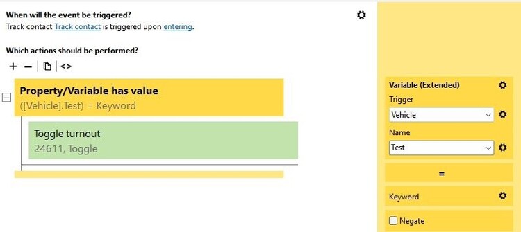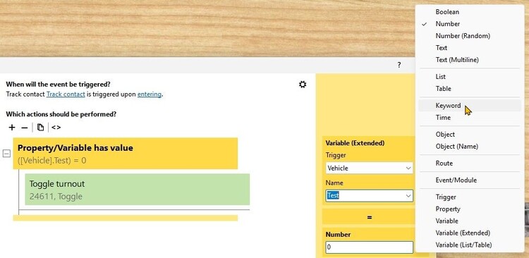 Hallo, The error message occurs because you select the object variable “Test” from the locomotive “OEBB 2048” as the vehicle. The object variable “Test” is a keyword. A keyword cannot be placed on a track contact. Do you want to check whether the locomotive “OEBB 2048” specifically has the object variable ‘Test’ as a keyword, or generally whether the locomotive entering the track contact has the keyword “Test”? Die Fehlermeldung entsteht dadurch, daß Du als Fahrzeug die Objektvariable "Test" von der Lok "OEBB 2048" auswählst. Die Objektvariable "Test" ist ein Schlüsselwort. Ein Schlüsselwort kann nicht auf einem Gleiskontakt stehen. Möchtest Du abfragen ob speziell die Lok "OEBB 2048" die Objektvariable "Test" als Schlüsselwort hat, oder allgemein ob die Lok, die den Gleiskontakt betritt des Schlüsselwort "Test" hat? EASY