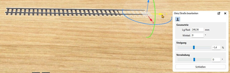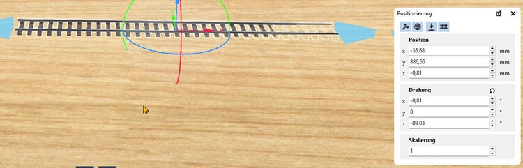 Hallo @Neo, das mit in der z-Drehung falsch angezeigte Gleis hat eine interessante "Eigenschaft"... ... wenn man Duplikate so aufreiht... ... ist deutlich eine Steigung zu erkennen. Ein Duplikat... ... mit dem Manipulator y in die Länge gezogen zeigt dann auch die Steigung an... und die entsprechende Verdrehung in der x-Achse... ... wobei sich die Drehung in der z-Achse wieder (fast) normalisiert (-90°). (Das Gleis ist in seiner Grundorientierung 0° wieder y-orientiert) ... vielleicht hilft Dir das ja bei der Analyse des Problems... Gruß EASY