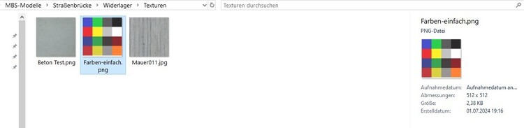 Hallo Max, die Farb-Datei oben ist nur ein Test. Das MBS hat zuerst nur gemeckert, weil die Datei 511x512Pixel hatte. Da war mir irgendwie eine Pixelreihe beim Speichern verlorengegangen. Der eigentliche Hintergrund meiner Frage ist, das ich mir eine Universaltextur für Farben erstellen möchte. Ich habe eine Internetseite gefunden, in der ausgewählte RAL-Farbtöne in RGB-Zahlen angegeben sind. Hier der Link: https://www.visual-graphics.de/de/service/ral-classic-farbtabelle/ Habe schon ein paar RAL-Töne ausprobiert und finde diese Hilfe ganz gut. Bei einzelnen Farbkacheln in der Größe von 64x64 Pixeln habe ich dann in einer Farbdatei mit 512x512 Pixeln 64 verschiedene RAL-Farben und kann diese dann als Standard für alles einsetzen. Und um einen Farbton dann nochmal nachträglich zu ändern brauche ich dann keine neue Farbdatei erstellen, sondern es reicht die gewählte Fläche auf eine andere Farbe oder einen anderen Farbton zu verschieben. So zumindest die Idee. Gute Vorbereitung ist der Weg zum Erfolg. Wird aber eine Weile dauern bis ich die eine solche Datei mit Paint erstellt habe. VG, Hawkeye
