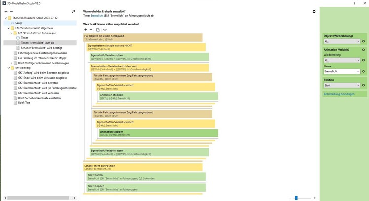 Hallo, um das Thema "Bremslicht" mal wieder richtig in den Straßenverkehr einzuordnen und den Thread von @Klartexter nicht mehr weiter zu belasten. Also ich bin dem Ergebnis per Timer ganz zufrieden. Für interessierte hier nochmal eine leicht überarbeitete Version mit Blinker und Bremslicht. Abzweig mit Blinker und Bremslicht 02.mbp @Neo, kannst du bitte mal erläutern, wie du "prüft ständig" ohne Timer umsetzt. Dies gilt doch für alle sich bewegenden Objekte, die auf z.B. eine Gleiskontakt zufahren und erst bei Unterschreitung eines gewissen Abstands vom Objekt zum Ziel ein Ereignis auslösen. VG, Hawkeye