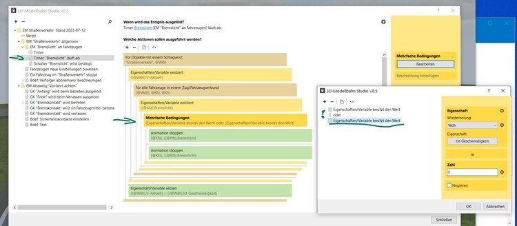 Hier noch eine kleine aber wirkungsvolle Ergänzung zur obigen Anlage. Wenn in diesem Ereignis noch die Bedingung "Ist-Geschwindigkeit = 0" abgefragt wird, dann leuchten die Bremslichter auch bei alle stehenden Fahrzeugen. Sind halt alles Automatik-Fahrzeuge, und die Fahrer müssen beim Halten auf der Bremse stehen bleiben. VG, Hawkeye