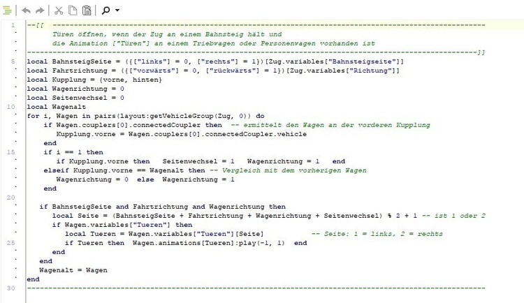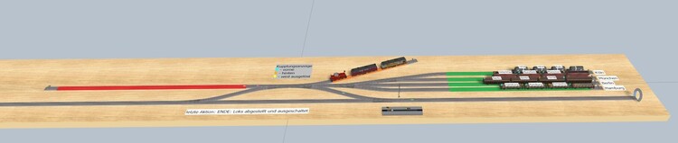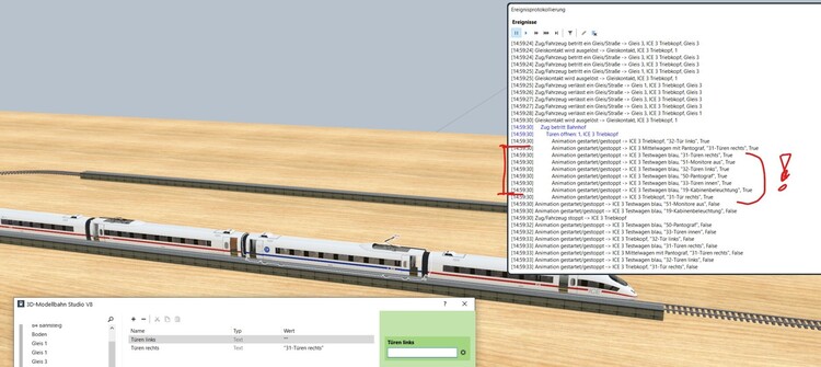 Hallo @Neo, habe mir mal dein Beispiel mit dem "Türen öffnen/ schließen" angeschaut und ein paar andere Wagen angehängt. Die erforderlichen Objektvariablen für die Türen habe ich zum Testen für diese zwei Wagen absichtlich mal nicht eingerichtet. Hier solltest du in der Demoanlage noch die Abfrage, ob die Objekt-Variablen auch tatsächlich existieren, integrieren. Noch besser wäre natürlich, eine programminterne Überprüfung auf das tatsächliche vorhanden sein und auf die Richtigkeit der Schreibweise einer Objekt-Animation. Sonst werden, wie im Bild oben alle vorhandenen Objekt-Animationen gestartet. Das ist ganz schön lästig und verwirrend. Die neue Funktion mit der Orientierung funktioniert ansonsten für die Fahrtrichnungen vorwärts und rückwärts gut. VG, Hakwkeye