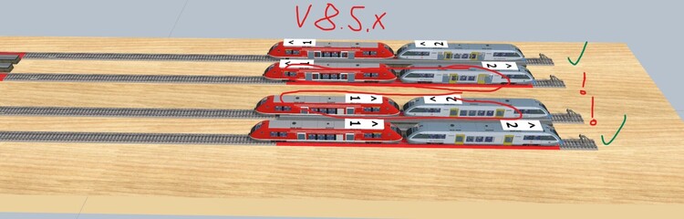 Hallo Neo, wenn es sich doch nur ausschließlich auf "Türen öffnen" beziehen würde. Auch andere Anlagen funktionieren seit V8.5.2 nicht mehr korrekt, in denen ich auf die Funktion getVehicleGroup() zugegriffen habe. Hier ein weiteres Beispiel, das unter V7 und bis V8.2.2 hervorragend gelaufen ist, und jetzt ein Chaos hinterlässt. Ergebnis in V7: Ergebnis in V8.5.2 Demo-Rangieren mit automatische Kupplungserkennung.mbp Dadurch sind mal soeben ein paar Monate mühselige Entwicklungsarbeit, bis das mal richtig funktioniert hatte, einfach für die Katz und in der neuen Version nicht mehr verwendbar. Eine solch gravierende Änderung in ein Update zu packen, das die Vorversion überschreibt ist doch wohl mehr als unglücklich gewählt !!!!!!!!! Diese Änderung erst in einer neuen Version ab V8.5.x anzubieten, hätte ich ja noch verstehen können. Wie komme ich jetzt wieder auf die Version V8.2.2 zurück? Welche Version ist das genau? VG, Hawkeye
