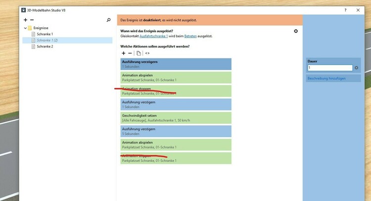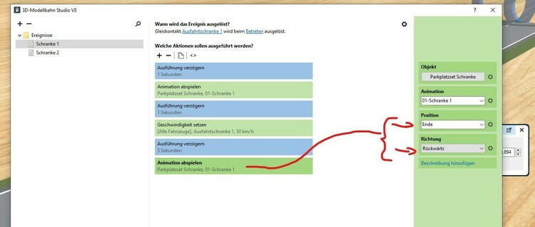Hallo @Klartexter, ändere die folgenden Einstellungen: Durch das Ereignis "Animation stoppen" werden die Schranken schlagartig geschlossen -> löschen "Animation abspielen" reicht. Sie stoppt automatisch, wenn die Endstellung erreicht ist. In den Einstellungen der Schranke auch die "Enlosschleife" auf "aus" stellen. Und noch eine Verzögerung einbauen, damit die PKW dann nicht zu früh losfahren. Damit die Schranken auch wieder schließen, die Richtung anpassen. VG, Hawkeye