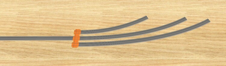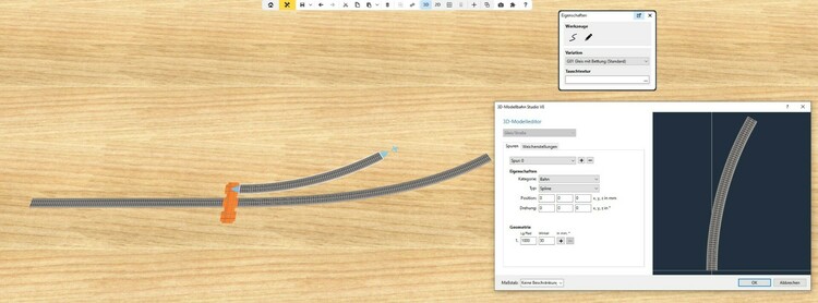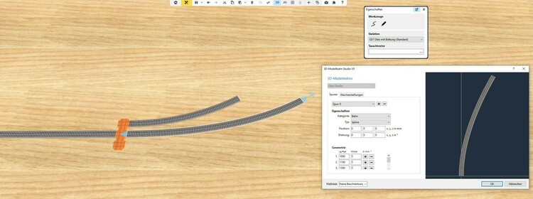 Hallo @EASY und @Phrontistes, Klothoiden näherungsweise zu erzeugen ist doch im Modelleditor für Gleise möglich und gar nicht so schwer. Nimm ein Gleis 30° Teile es im Editor z.B. in 6 Abschnitt á 5° und denk dir eine Formel aus wie der Übergang aussehen soll. Hier als einfaches Beispiel mit 6 x Winkel 5°: 1. R1 = 1000 2. R2 = R1 + X 3. R3 = R2 + 2 * X 4. R4 = R3 + 3 * X 5. R5 = R4 + 4 * X 6. R6 = R5 + 5 * X In diesem Bild ist X = 100 oder etwas größer mit einer anderen Formel. Für das Gegengleis das erstellte Gleis einfach kopieren und dem Winkel ein (-)-Zeichen voran setzen. Du braucht dann auch nur ein Übergangs- und ein Gegenstück erzeugen. Für Parallelgleise kannst du die Funktion "Pfad folgen" mit Eingabe des benötigten Gleisabstandes verwenden, ohne das Parallelgleis neu berechnen oder von Hand neu erstellen zu müssen. Hat auch den Vorteil, das die Spline-Eigenschaften erhalten bleiben und mit "Pfad folgen" auch Brücken oder Bahnsteige der Form folgen. Bei einzelnen kurzen Gleisstücken würde das nicht so aussehen. VG, Hawkeye