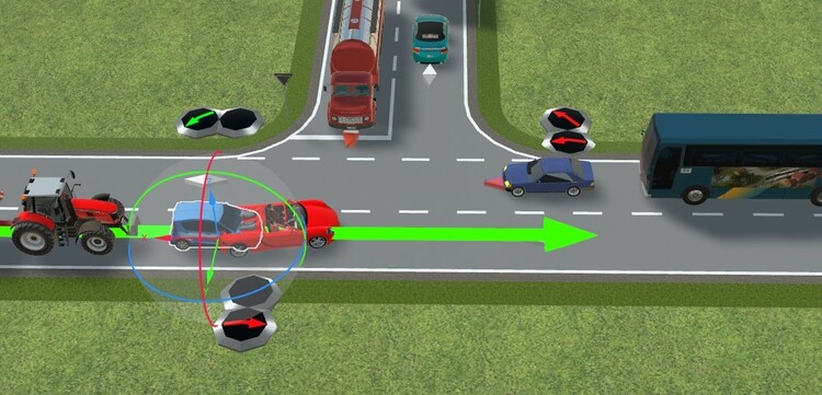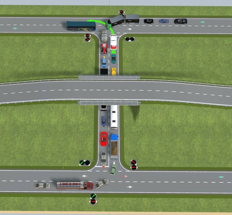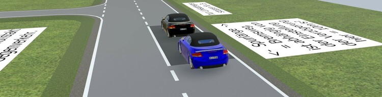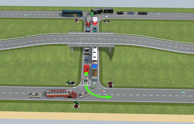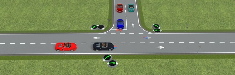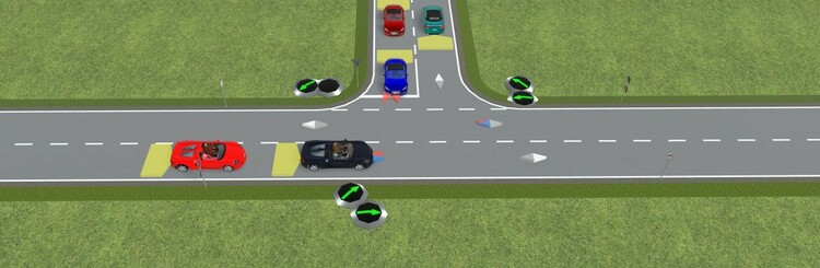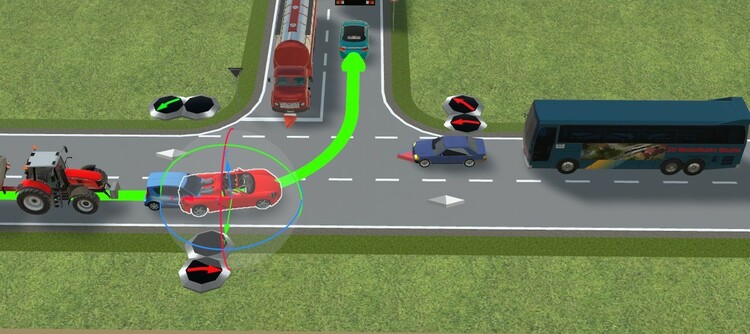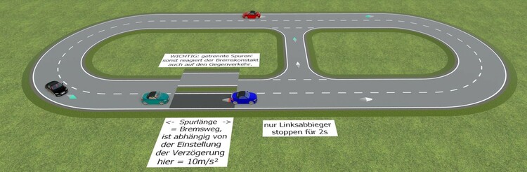Hallo Thomas, über einen kleinen Umweg geht das. Hier ein Beispiel mit nur einem Bremskontakt. Linksabbieger warten 2s bevor sie weiterfahren. "Geradeaus" fahrende Fahrzeuge fahren durch und stoppen nur hinter den Linksabbiegern, wie es sich gehört. Wird natürlich durch den Blinker angezeigt. Nur ein Bremskontakt.mbp Den Gegenverkehr habe ich in der Demo zum Testen erstmal weggelassen. Noch nicht perfekt, aber ausbaufähig. Viele Grüße, Hawkeye