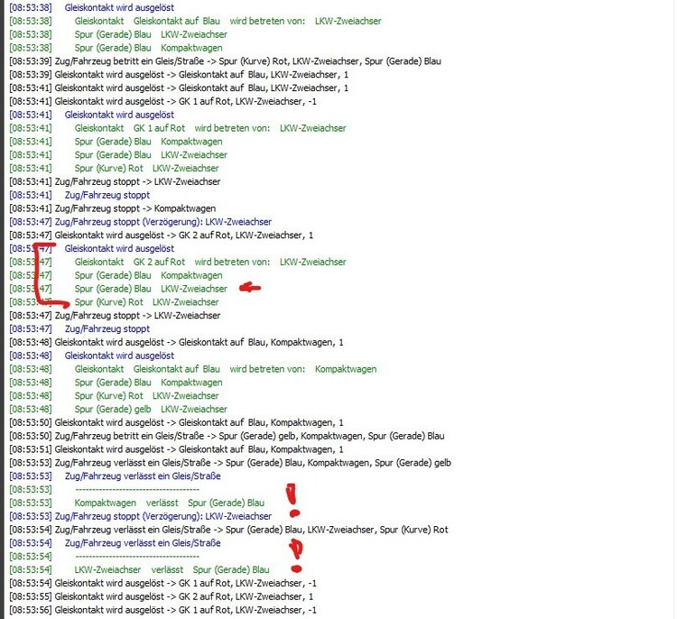 Hallo Neo, Ja, das habe ich dadurch gelöst, das ich diese Spuren in der Kreuzung durch einspurige Straßen ersetzt haben, da auf einzelne Spuren einer Kreuzung ja nicht zugegriffen werden kann. Das wäre klasse. Eine schöne Zukunftsvision. Können wir die für V9 erwarten? Nicht nur, sondern auch Fahrzeuge, die eigentlich gar nicht fahren sollten, können eine Gruppenbildung auslösen. Das wird aber durch die im Moment vorhandenen Situation, das Fahrzeuge durch andere Fahrzeuge "hindurchfahren" können, begünstig. Hier ein Beispiel: Der LKW biegt ab und bremst an den GK's (rot und weiß) 2x ab (steht z.B. im Stau). Der PKW will geradeaus fahren. Stoppt der LKW am GK 1 "rot", steht der LKW mit seine Zentrum noch auf Spur "Blau". Dann ist noch alles ok, der PKW bremst noch ab. Stoppt der LKW aber an GK 2 "weiß", steht der LKW mit seinem Zentrum schon auf Spur "rot". Damit verliert der PKW den Kontakt zum Ende des LKW und fährt weiter. Laut Ereignisprotokoll steht der LKW aber noch auf Spur "blau"! (siehe Ereignisprotokoll unten) Letztlich verlässt der PKW die Spur "Blau" vor dem LKW. Und das darf nicht sein. Siehe Ereignisprotokoll. Es fährt also ein unkontrolliertes Fahrzeug (hier der PKW) in einer Kreuzung weiter und kann an anderer Stelle eine Gruppenbildung auslösen. Das wäre dringend zu verbessern. Viele Grüße, Hawkeye PS: Warum der LKW laut Protokoll in einer Situation auch auf Spur "Gelb" steht, verstehe ich nicht.